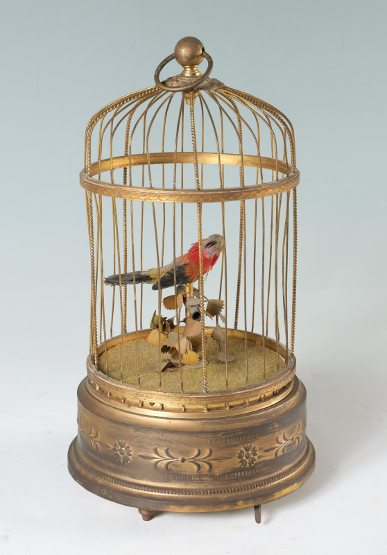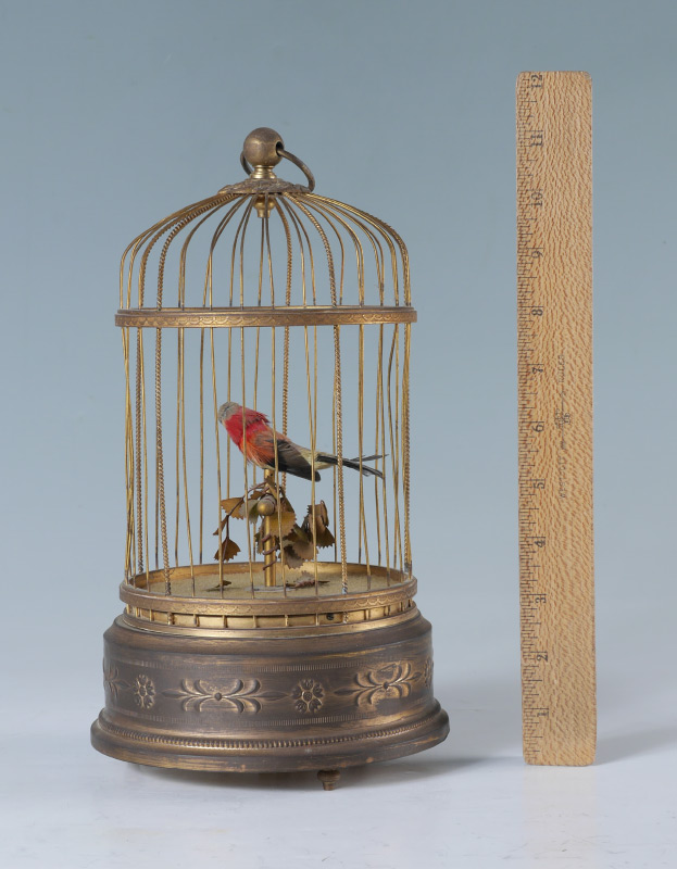 BRASS SINGING BIRD IN CAGE AUTOMATON: Single bird with feathers, patinated brass cage and base, no visible makers mark. Overall measures 11 1/4'' h. x 6'' dia.