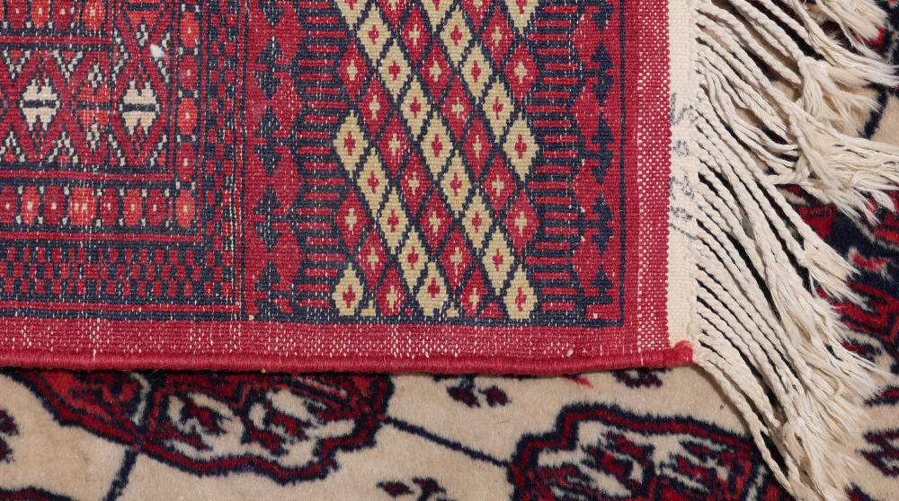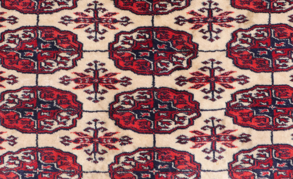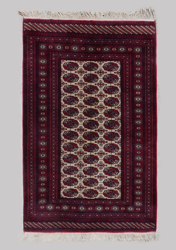 APPROX. 20-35 YR OLD PAKISTANI BOKHARA HAND KNOTTED WOOL RUG, 4'3'' x 6'4'': An unusual white ground is a distinctive feature of this otherwise traditionally designed rug. Red, pink, white, and black colored ''guls'' in two patterns cover the field. The good fine weave and clear colors make this an above average example of this type of rug. Condition is good.