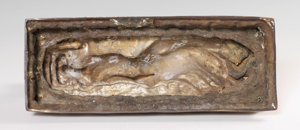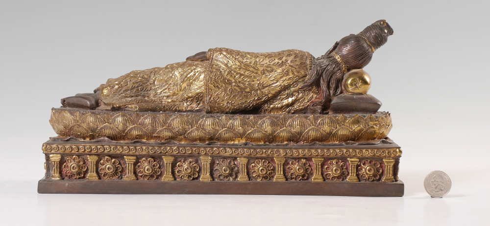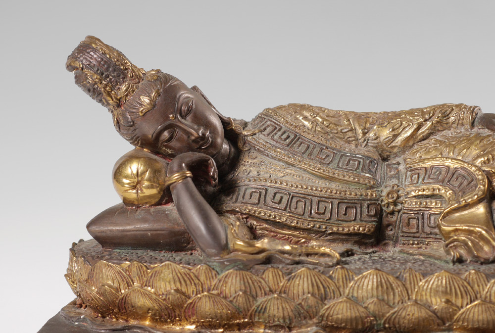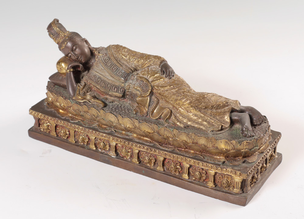 GILT BRONZE FIGURE OF RECLINING BODHISATTVA: Bronze figure with gilt accents, reclining or sleeping bodhisattva on lotus blossom, base with columns and floral motif. No visible signature or markings. Measures 6 1/4'' h. x 13'' x 4 3/4''.