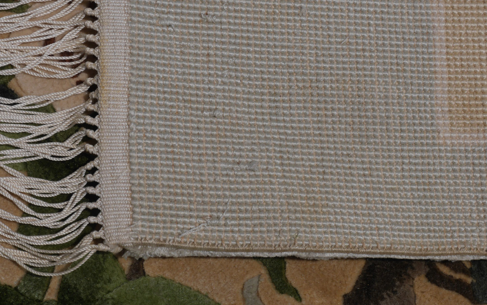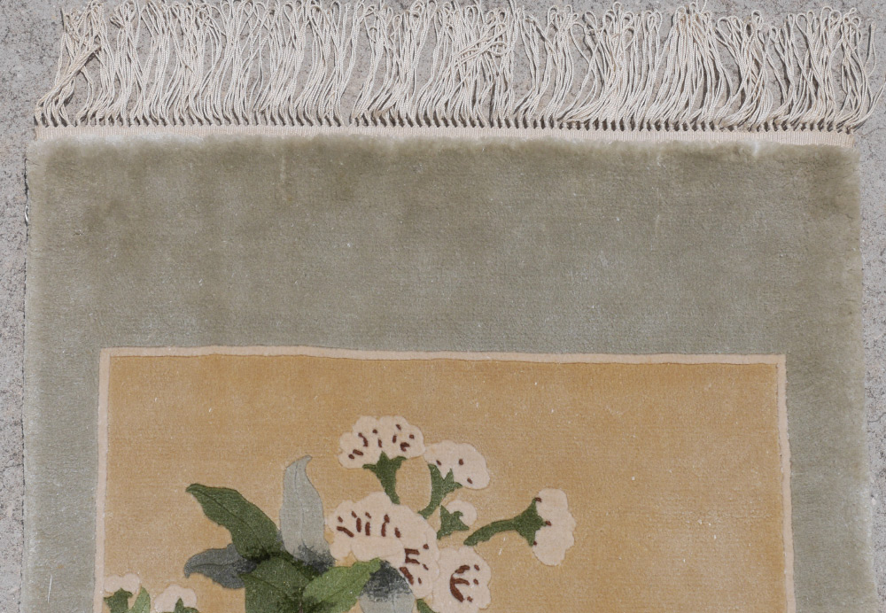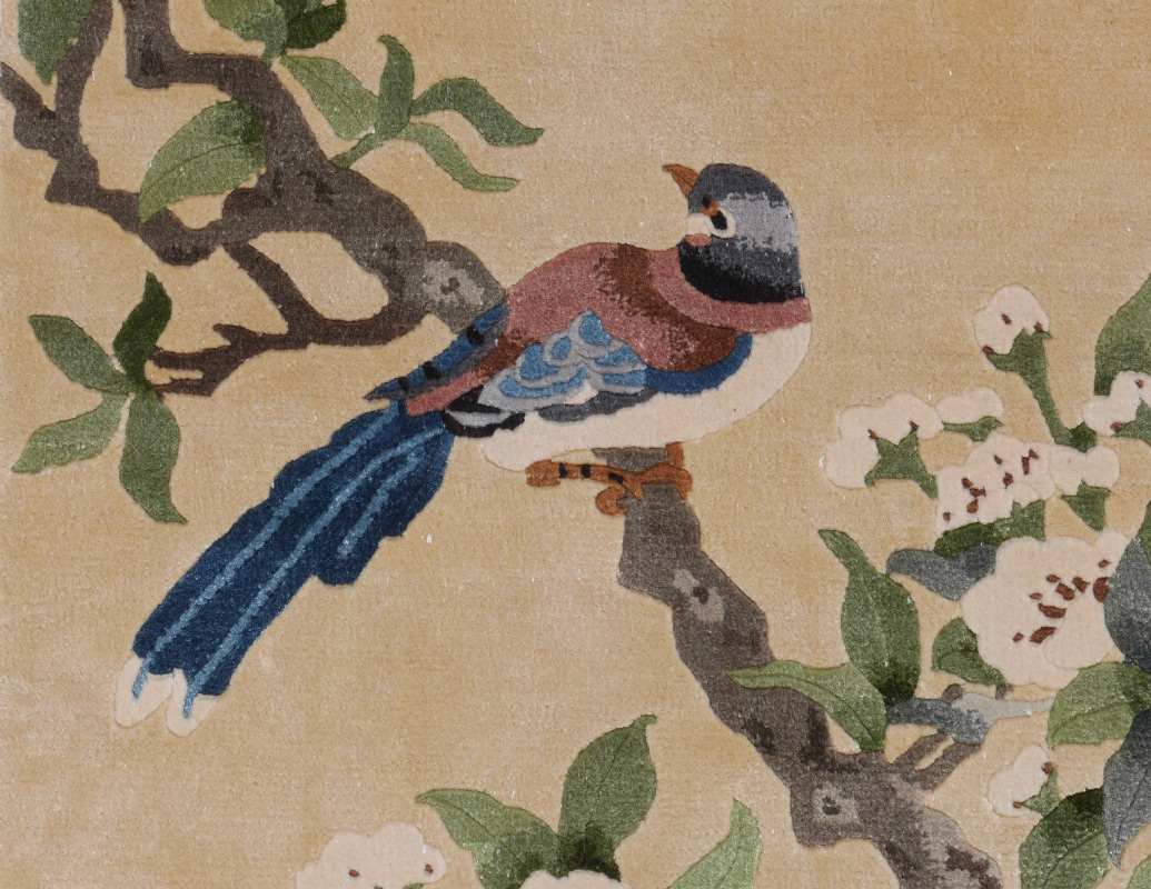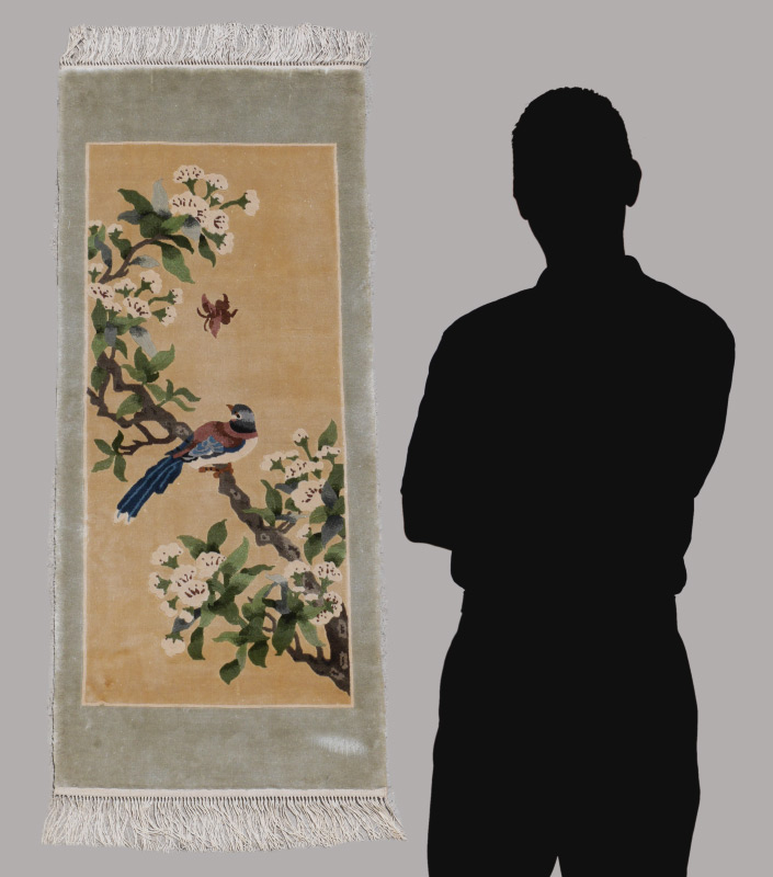 APPROX.20-35 YR OLD CHINESE HAND KNOTTED SILK RUG, 1'6'' x 3'7'': One well drawn bird perches on a branch of a flowering tree while a butterfly hovers nearby. The golden beige field is bordered by a pale grey/blue edge. Condition is good.