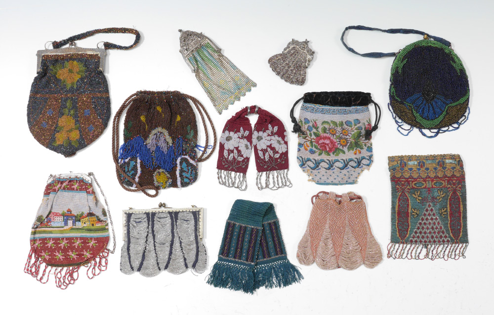 ESTATE COLLECTION OF ANTIQUE BEADED PURSES: 12 piece lot to include 2 miser purses, a Whiting & Davis enameled mesh purse and 9 beaded purses, one being for change.