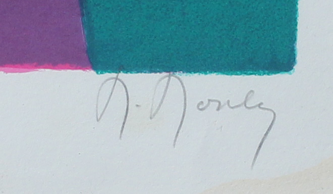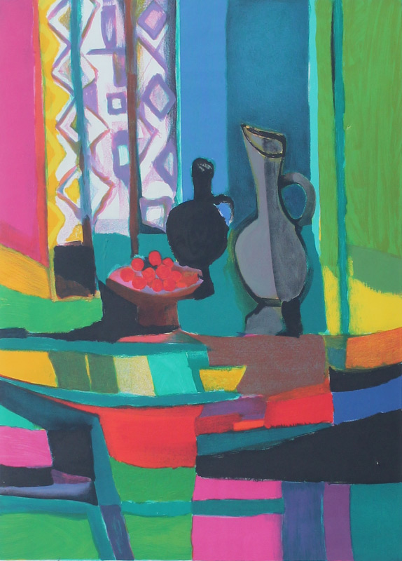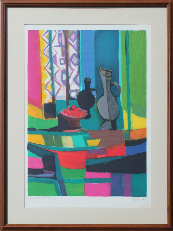 MOULY, Marcel (France, 1918-2008): Interior Tabletop Still Life Scene, Color Lithograph, 30'' x 22'', signed lower right marked, Approved Artist, lower left II/XXX, framed 38'' x 30.25''. Mouly was a protege of Fernand Leger but mostly known as the last living student of Pablo Picasso. His work is highly influenced by the works of Braque, Picasso and Matisse. Mouly studied at the French Academies in 1935 then went on to have his first solo exhibition at the Libraire Bergamasque in Paris, France in 1949. His work is still displayed in several prominent European galleries, including, Centre Georges Pompidou and Musee Nationale d'art Modern.