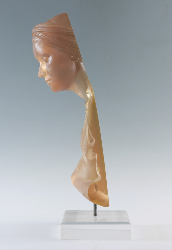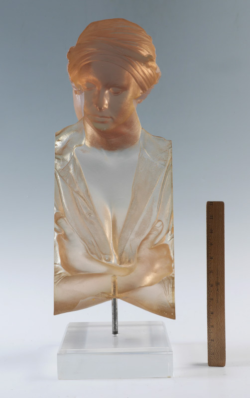 MARC SIJAN ACRYLIC SCULPTURE: Toned acrylic bust of a woman wearing a headwrap and blouse, clear Lexan base, no visible signature on bust or base. Overall measures 26'' h. x 9'' x 12.