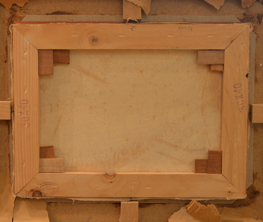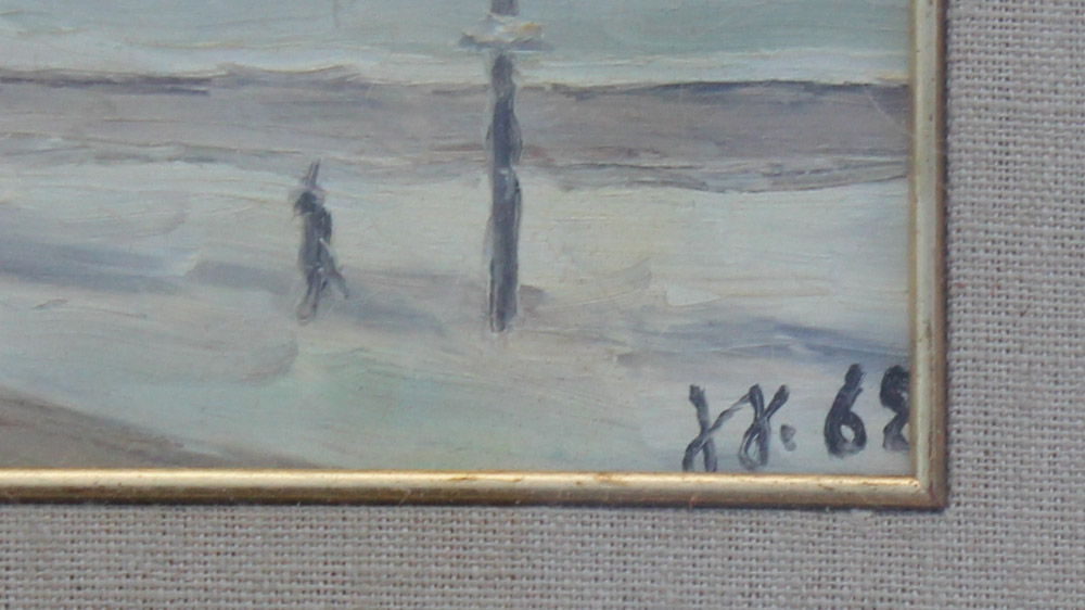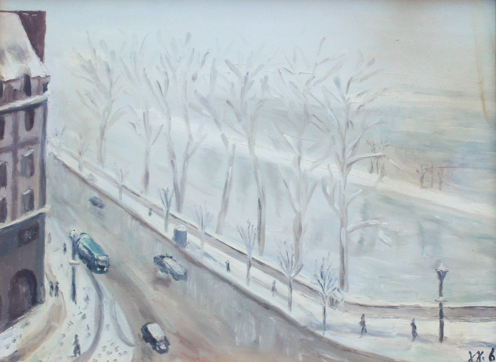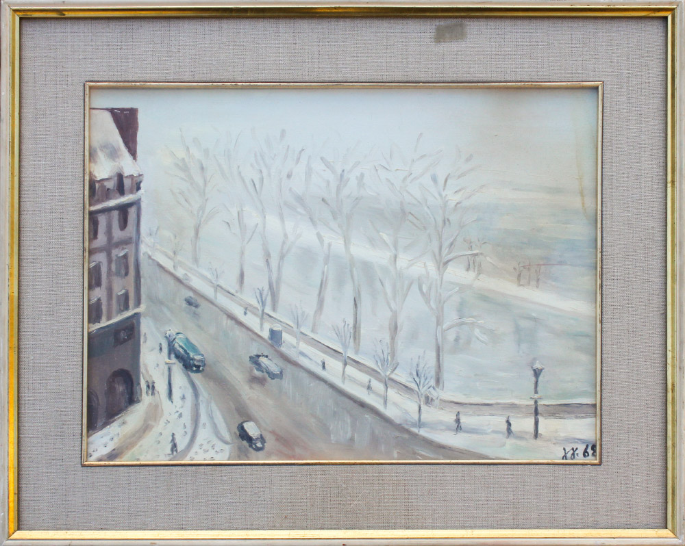 EUROPEAN IMPRESSIONIST URBAN PAINTING ILLEGIBLY SIGNED: Oil/Canvas, 11 5/8'' x 15 1/2'', signed lower right and dated ''68. Scene depicts a winter urban street, view from above, framed under glass, 16 1/4'' x 20 1/4'', there is a ''Baraldini Guido'' stamp in stretcher verso.