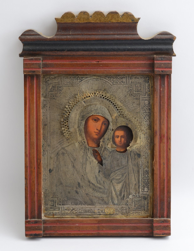 19TH CENTURY MADONNA AND CHILD ICON: Painted on Wood, 8 5/8'' x 6 5/8'', chased metal oklad with cyrillic inscription. Encased in painted wood frame, 13.25'' x 9.25''.