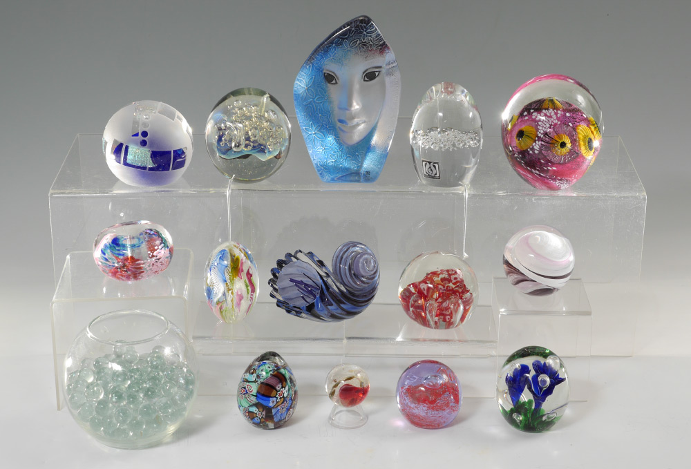 ESTATE COLLECTION OF 14 PAPERWEIGHTS: An assembled collection of 14 pieces total, signed pieces to include Caithness ''Moon Crystal'', Eickholt, St. Clair, Mats Jonasson, and illegibly signed. Mats Jonasson piece measures 5 3/4'' h.