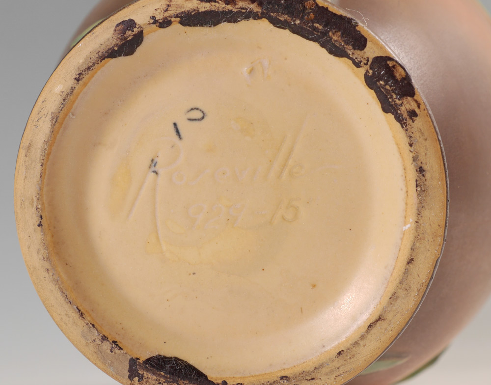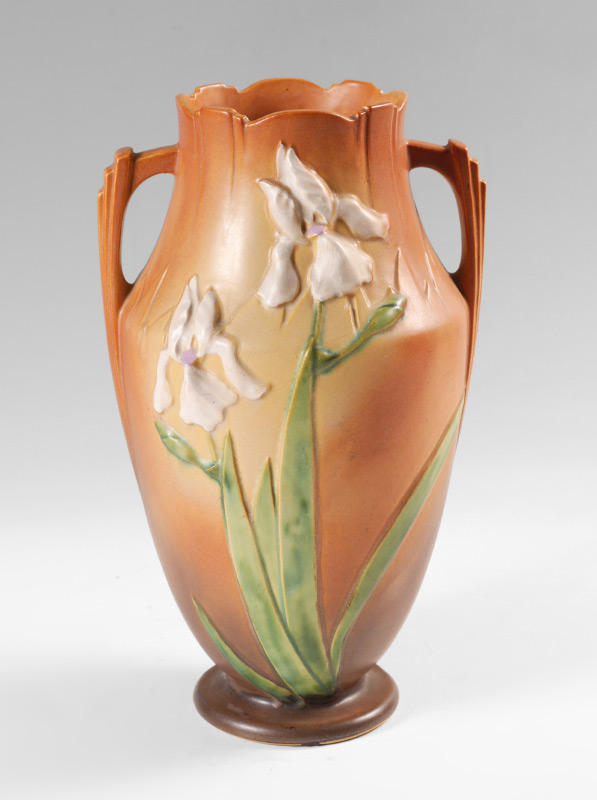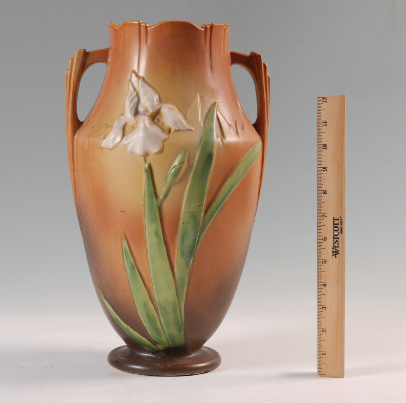 LARGE ROSEVILLE IRIS 929-15 DOUBLE HANDLED VASE: Brown toned Iris design, double handle, incised Roseville 929-15 on base. Overall measures 15 1/4'' h. x 9''.