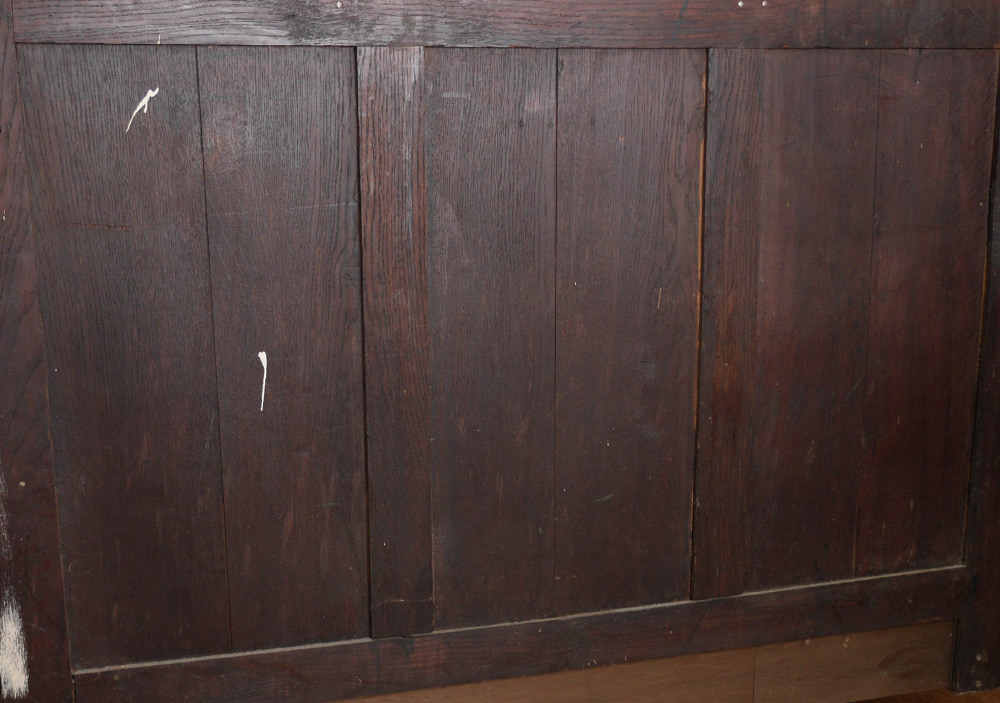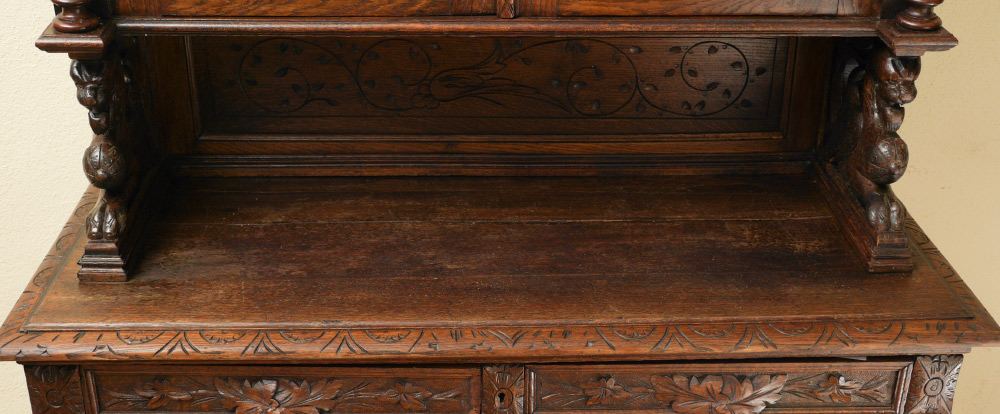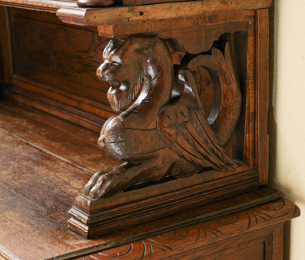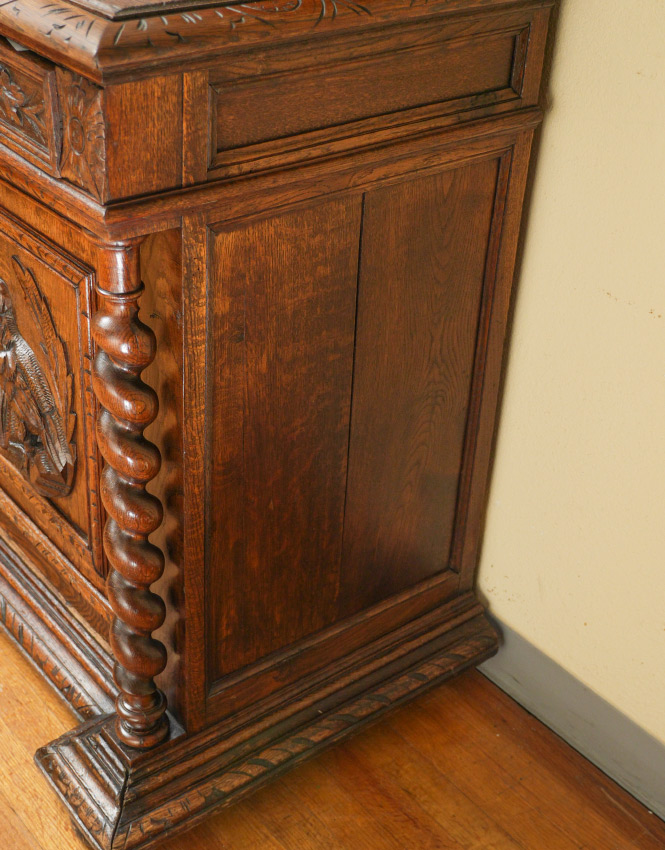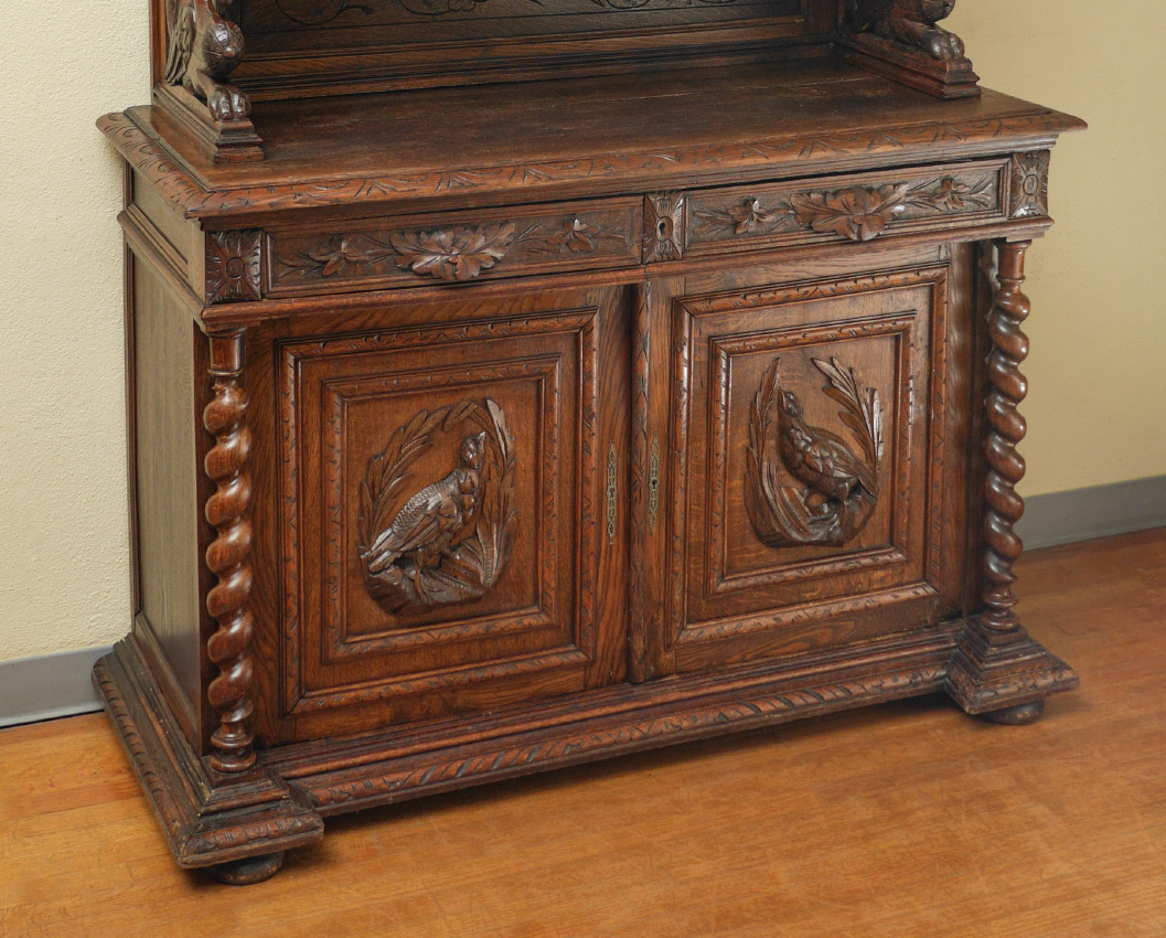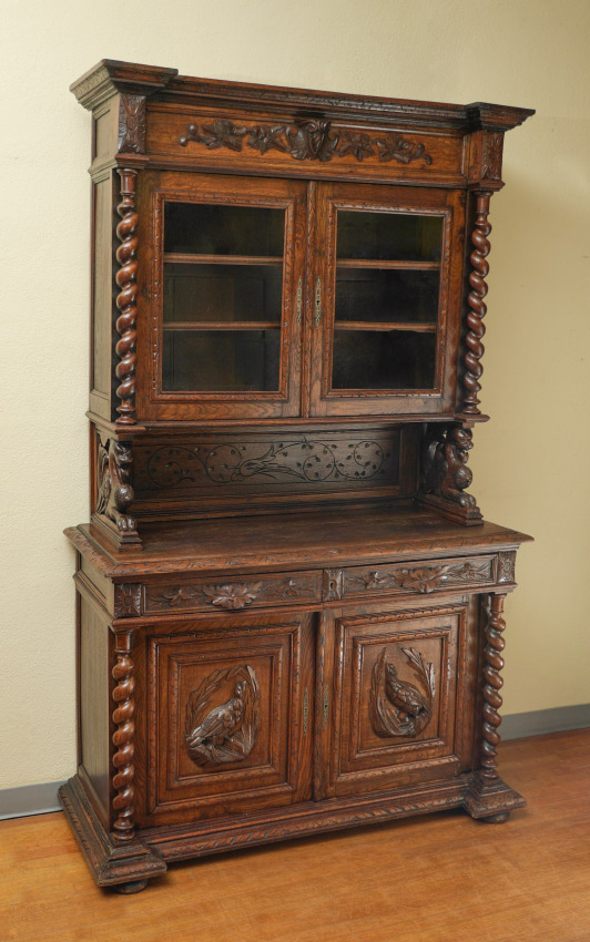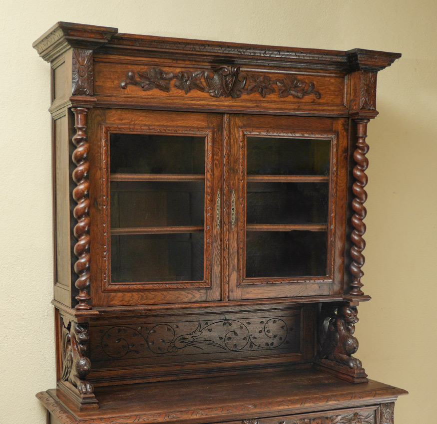 GOTHIC REVIVAL CARVED OAK HUTCH: Carved pediment with applied oak leaf and shield crest, 2 glass doors with 2 internal shelves, barley twist columns, figural griffon carved supports. Base with 2 drawers over 2 doors. Drawers with wood leaf pulls, doors with figural birds in panels, barley twist columns, overall measures 90 1/2'' h. x 55'' x 23 1/2''.