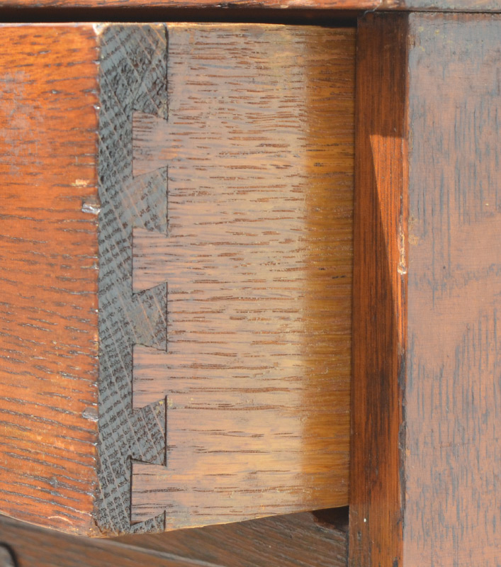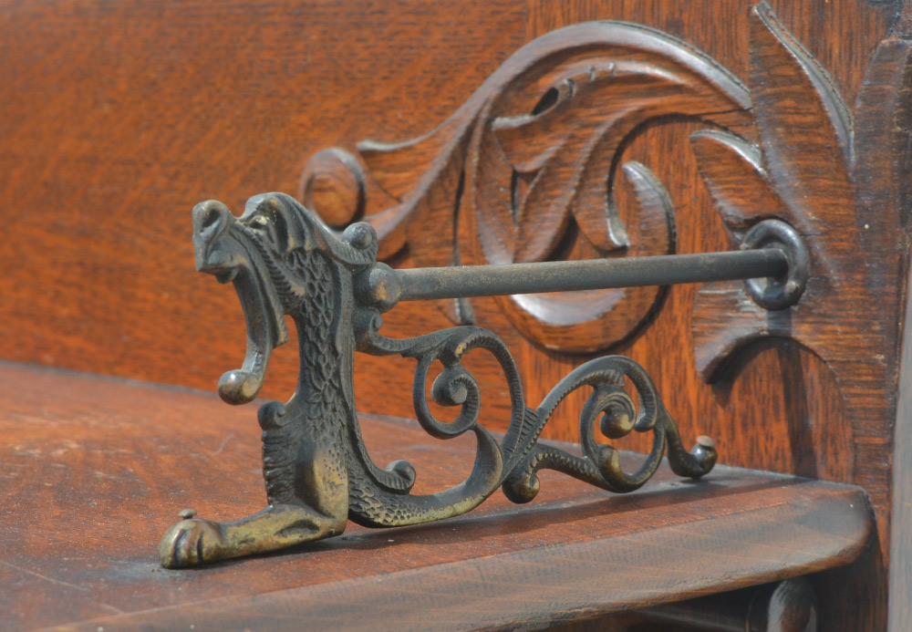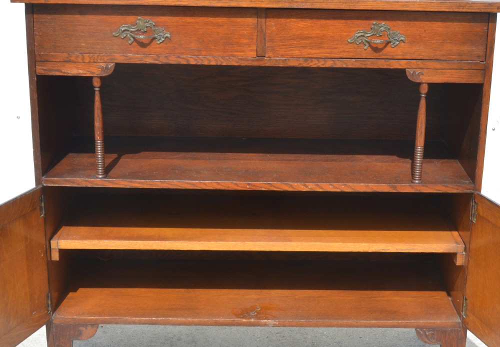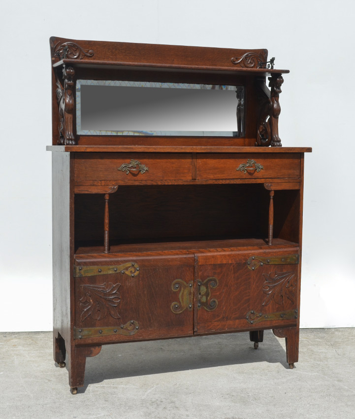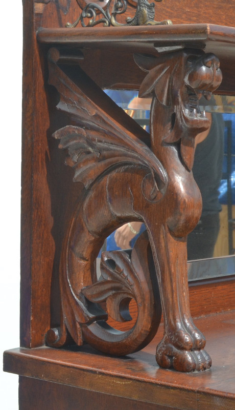 GOTHIC REVIVAL CARVED SERVER: Top pediment with carved decoration, brass griffon rails, shelf supported by 2 figural winged griffons, beveled glass mirror backsplash. Base with 2 drawers over open storage with turned spindle supports, 2 carved lower doors with metal hardware. Overall measures 60 1/2'' h. x 44 1/2'' x 17''.