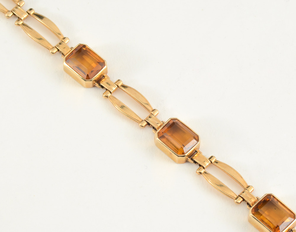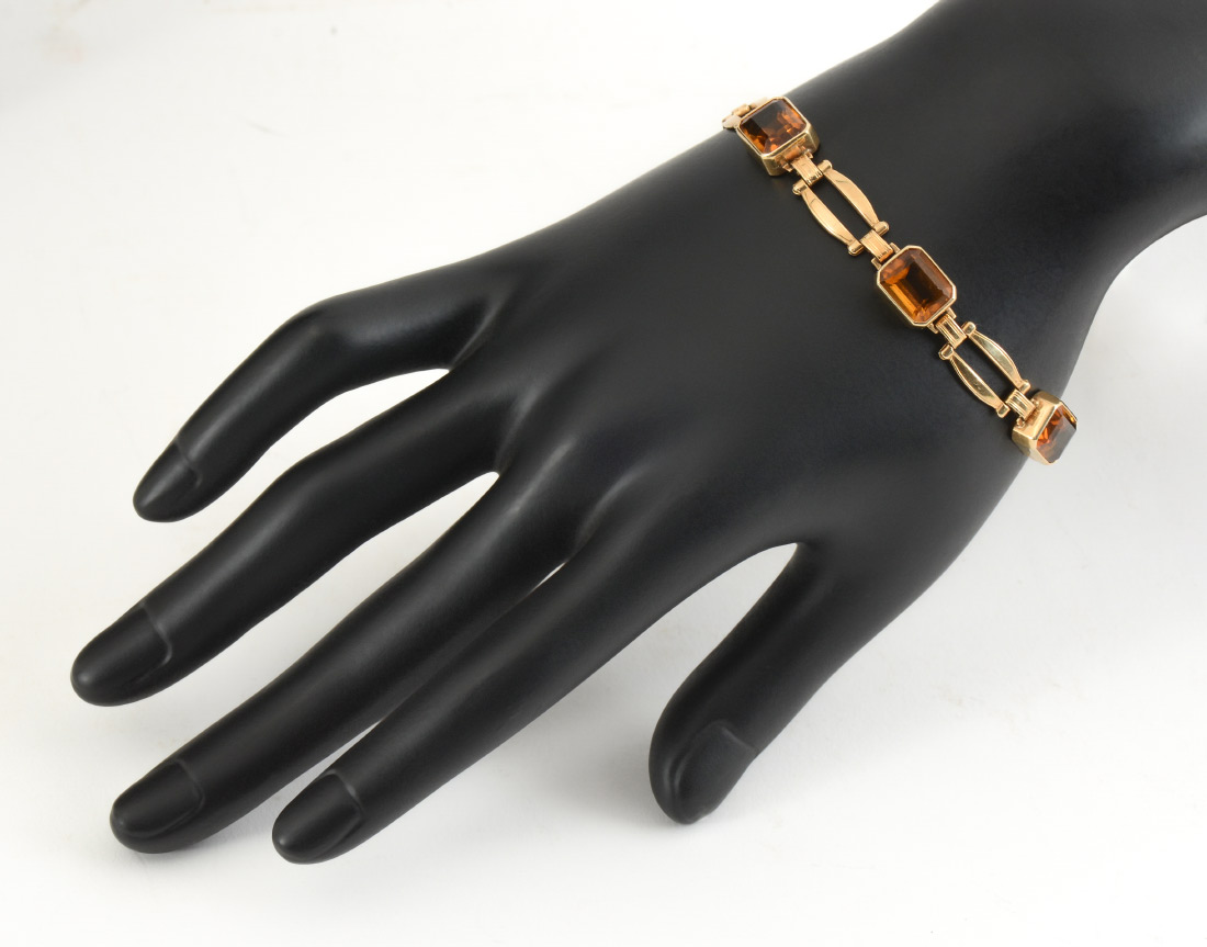 14K GOLD 10.00 CTW CITRINE BRACELET: 14K yellow gold bracelet contains 3 emerald cut ''Madeira'' citrines. Weight 10.00 Ct. Approx. The citrines are bezel set. Spring ring clasp. Weight 12.0 grams. Length 7''.