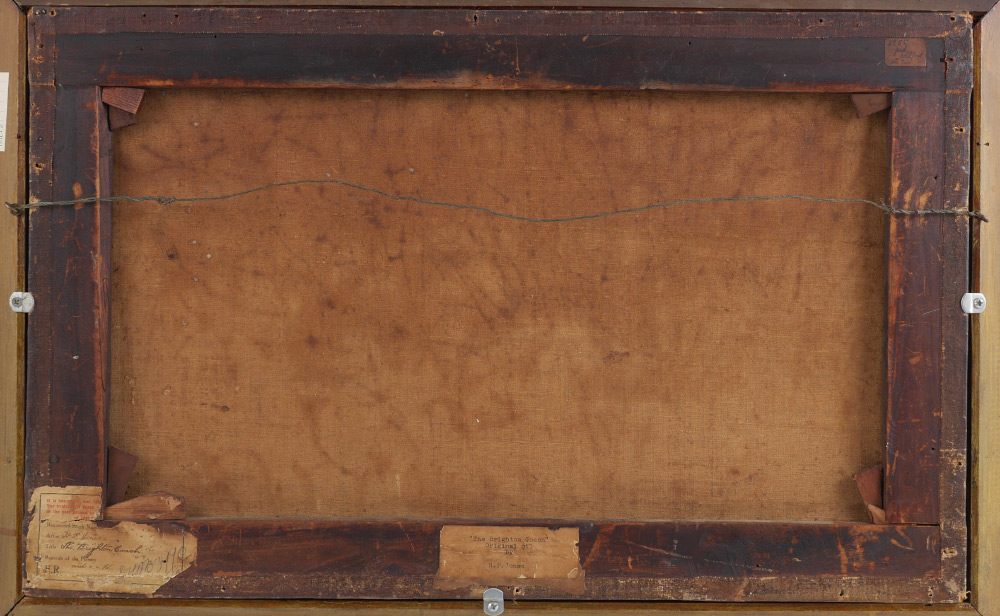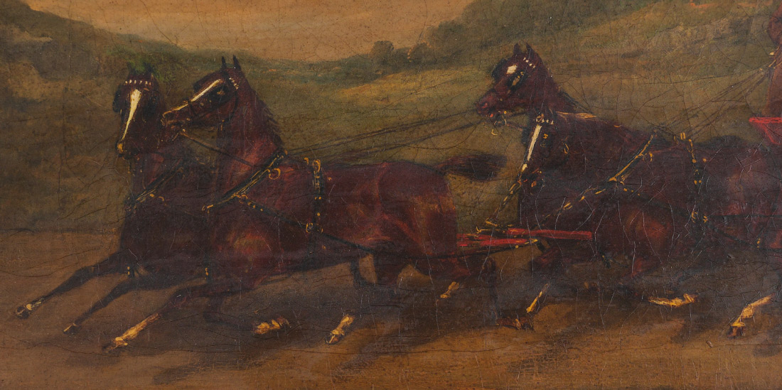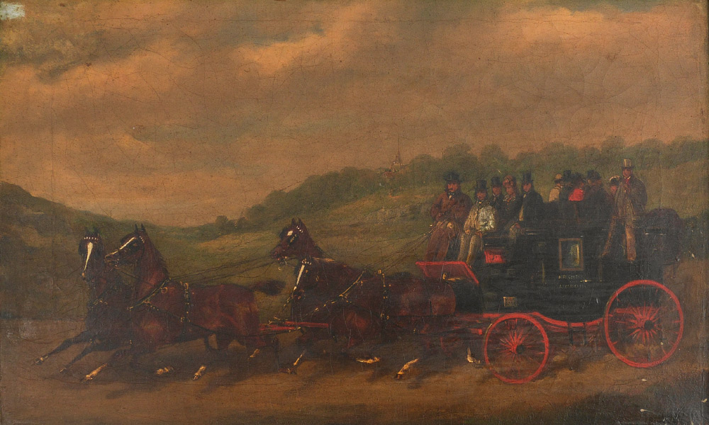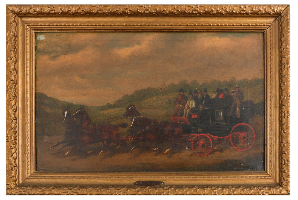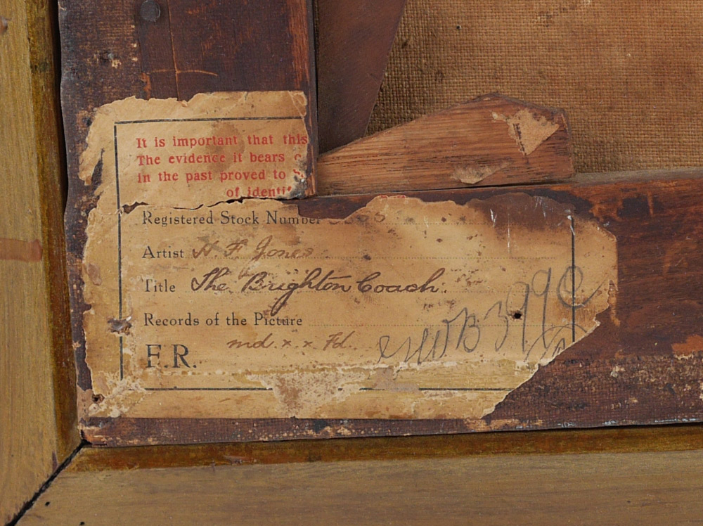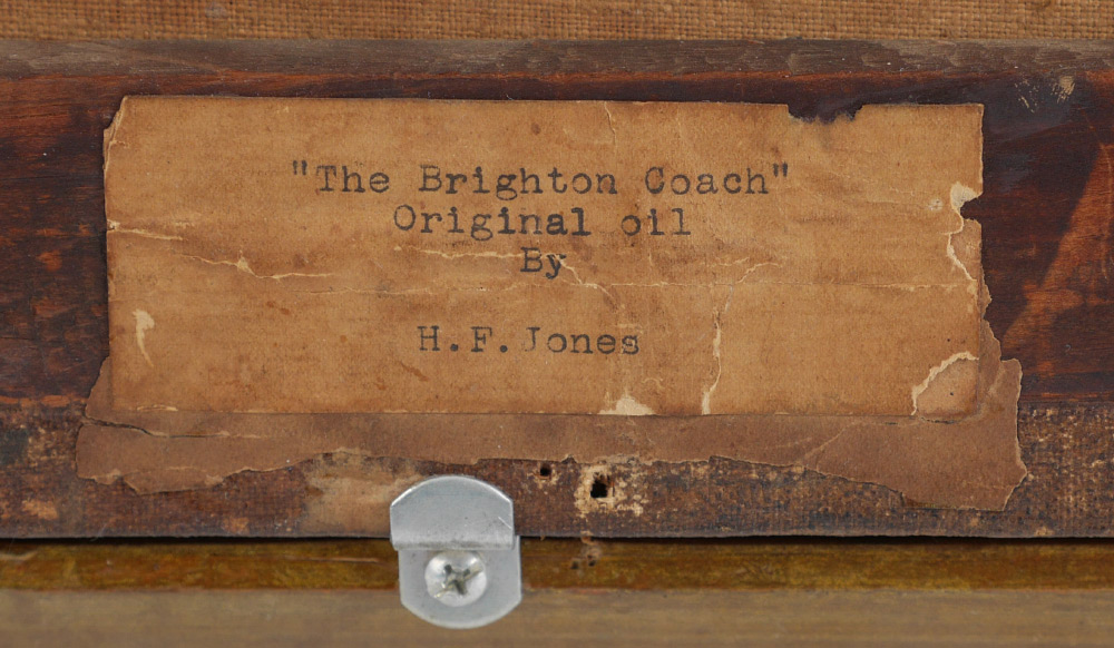 JONES, Henry Festing, (British, 1851-1928): ''Brighton Coach'' Oil on Canvas, 14.825'' x 24.825'', Several older labels affixed verso, gallery labels and Doyle Auction label, signed lower right, overpainted gilded gesso frame, 18.75'' x 28''. Jones was a solicitor and writer, best known as friend and posthumous biographer of Samuel Butler.