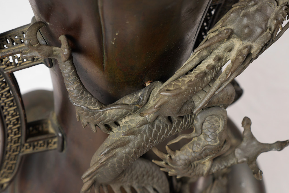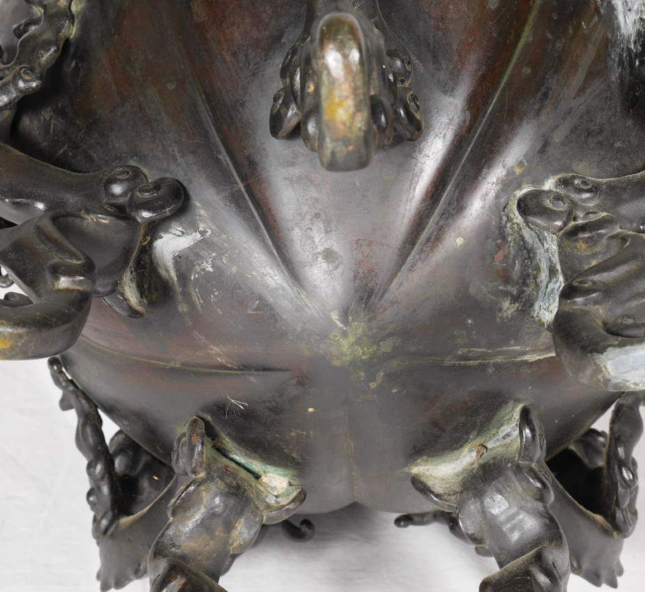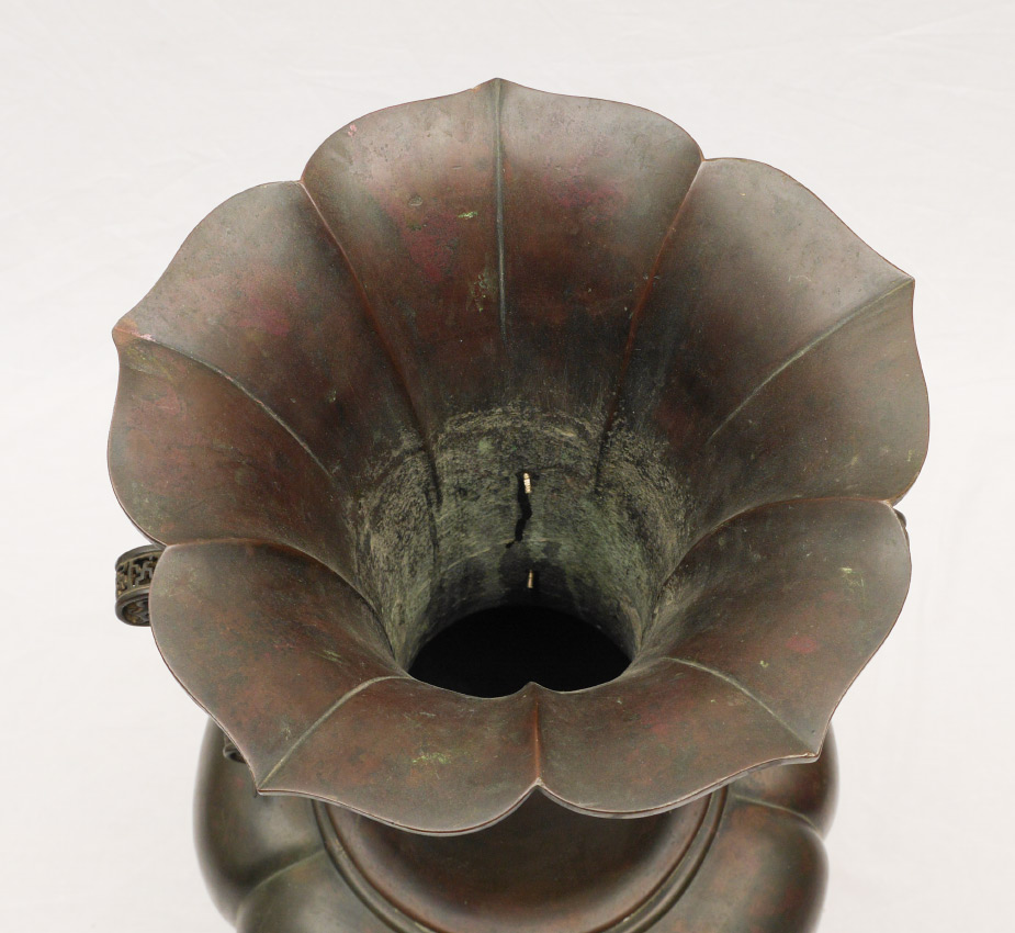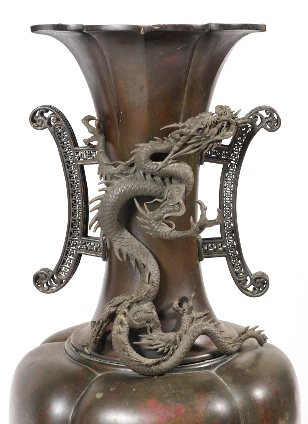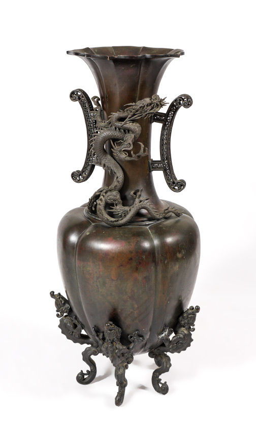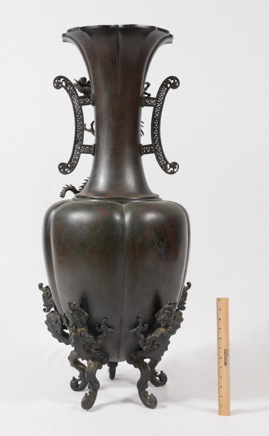 LARGE JAPANESE MEIJI PERIOD DRAGON VASE: Bronze body with flared rim, tapered neck, bulbous fluted body. Applied pierced handles and figural dragon, 4 mythological creatures as legs. No visible signature or markings, overall measures 39 3/4'' h. x 18''.