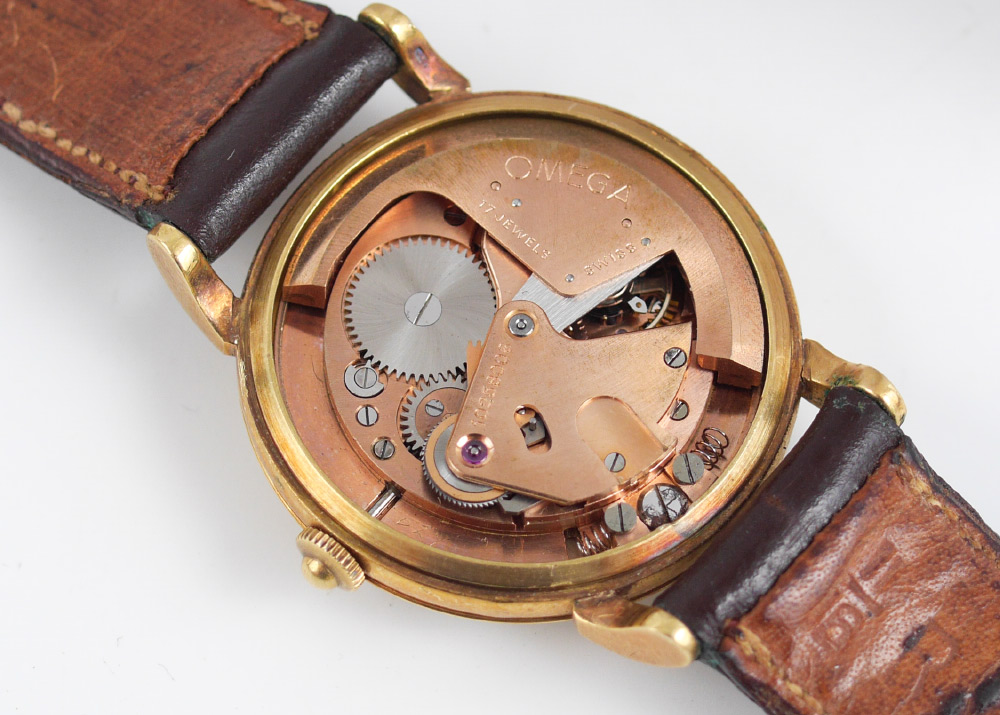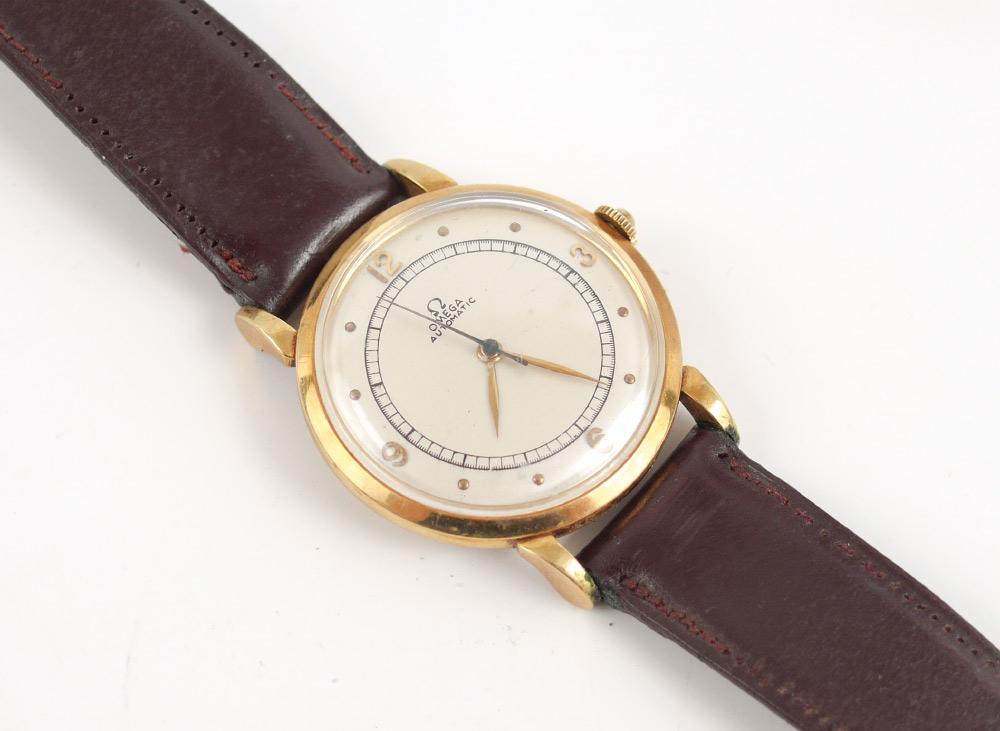 VINTAGE 18K OMEGA AUTOMATIC MEN'S WATCH WITH LEATHER STRAP: Handsome vintage gents watch with 34mm 18k gold case and brown leather strap. 12, 3, 6 & 9 hour markers and gold marks for the remaining hour markers. Currently in running order.