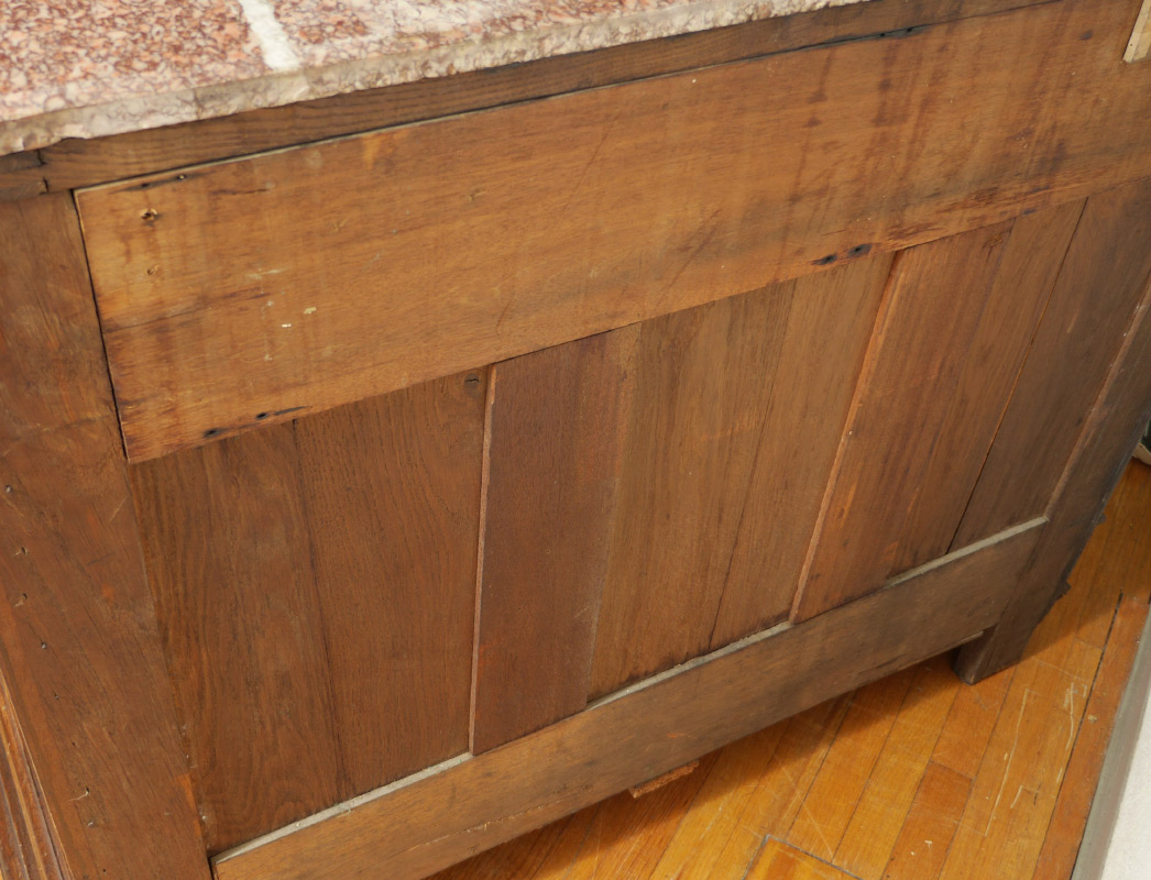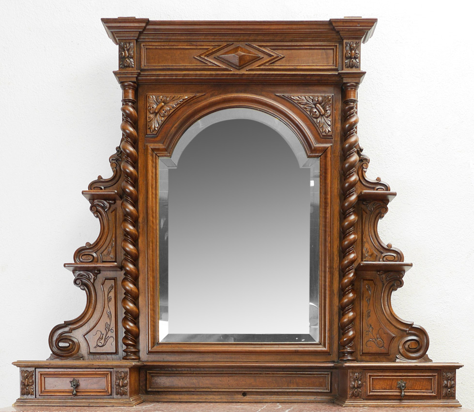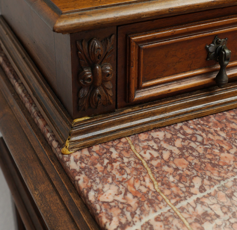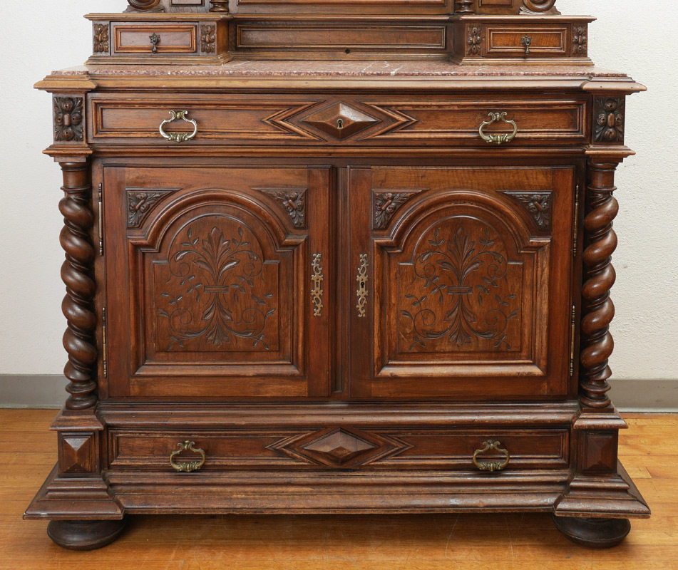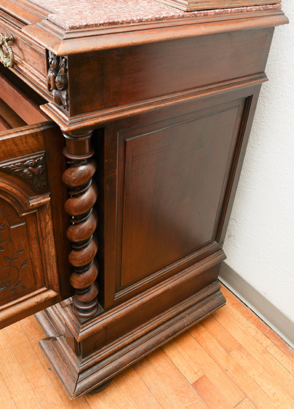 VICTORIAN MARBLE TOP DRESSER WITH MIRROR: Shaped and beveled glass mirrored top with carved decoration, 2 glove boxes. Pink variegated marble top base, single full length drawer over 2 carved panel doors with 3 internal drawers over single full length drawer. Barley twist columns, overall measures 83 3/4'' h. x 52 1/2'' x 23 1/2''.