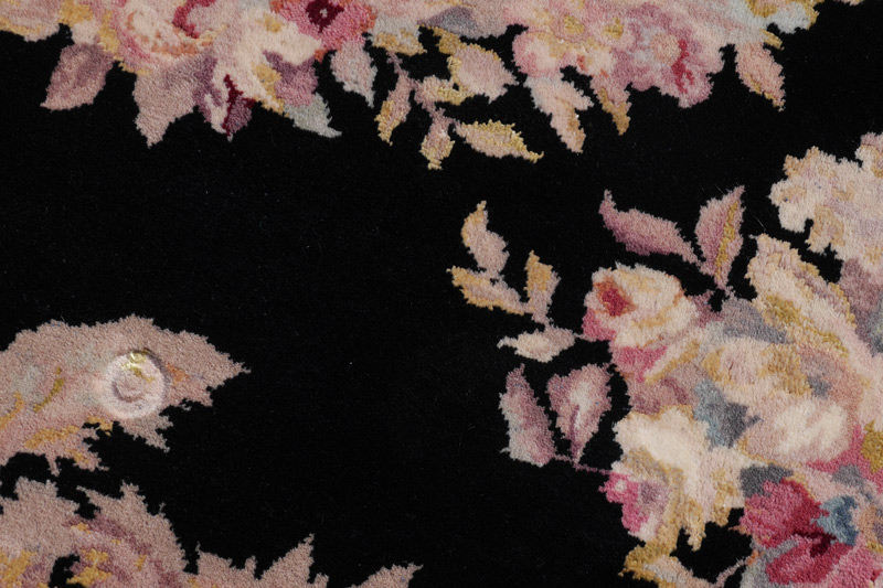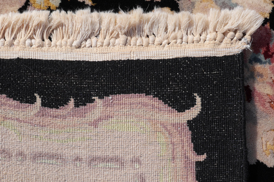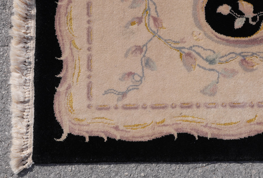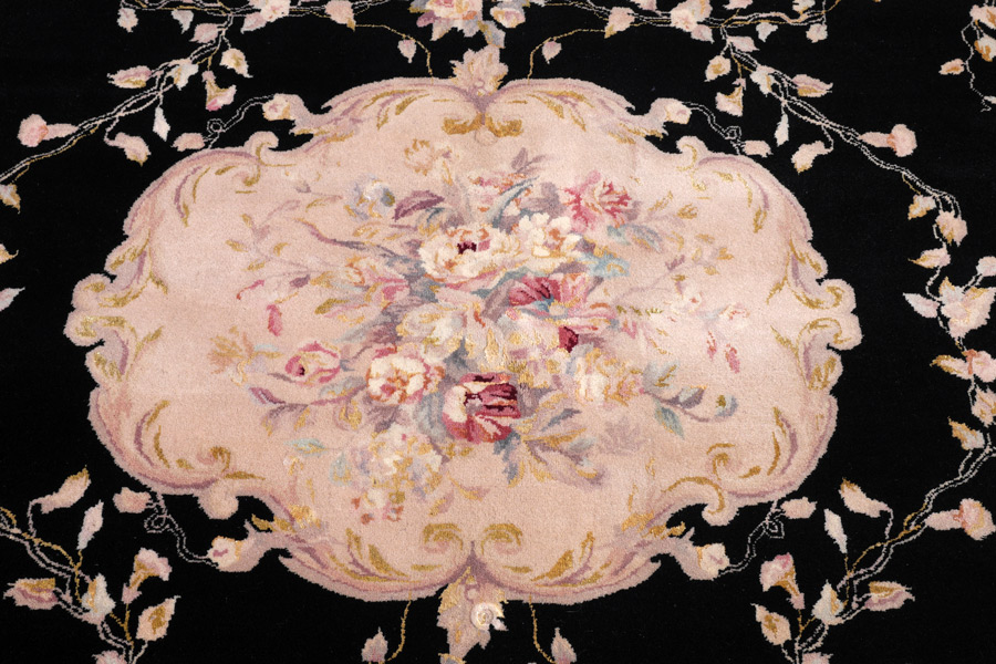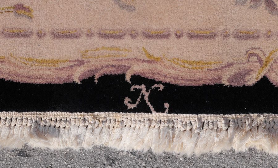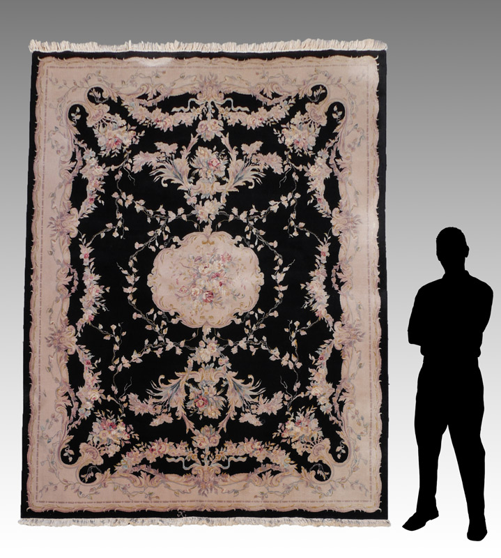 APPROX. 30-45 YR OLD CHINESE FRENCH AUBUSSON DESIGN HAND KNOTTED WOOL RUG, 7'8'' x 10': This rug has a striking appearance with its black background setting off the pastel Aubusson floral design. A large rounded beige / ivory central medallion has a center of pastel flowers in rose, green, yellow, and pale pink. Garlands of the same type flowers go all around the field along with smaller garlands of leaves in the same colors. A wide ''broken'' border and seemingly silk highlights accent this lovely rug. There is a letter at one end inscribed in the black edge of the rug, a maker's mark perhaps. Condition is good with wear consistent with age.