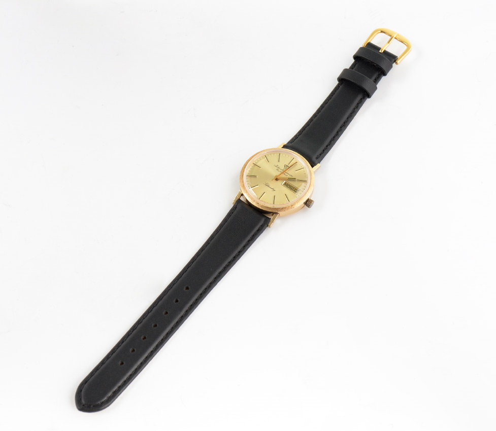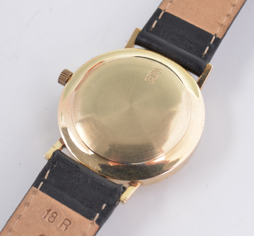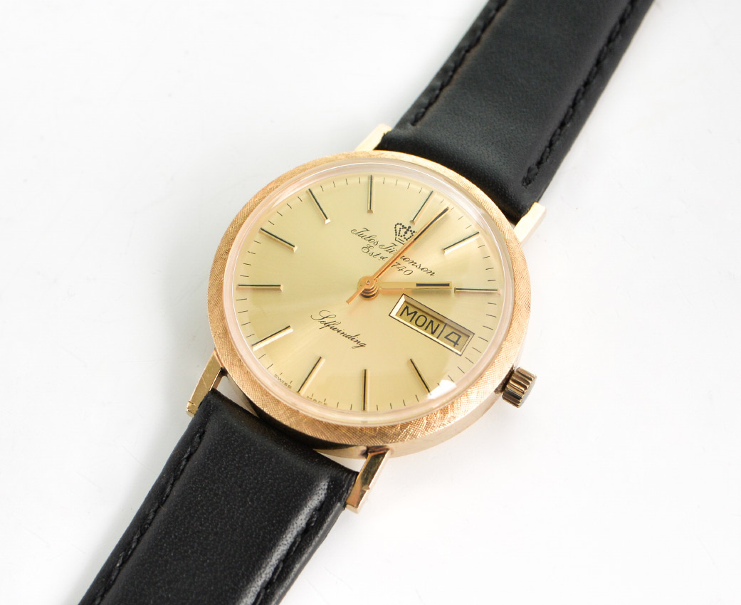 VINTAGE JULES JURGENSEN 14K GOLD WATCH W/DAY & DATE: Stuller leather band is attached to the 14K yellow gold case. The gold metallic dial features brilliant gold and black hour markers and hands, and a calendar window that shows the day and date at 3 o'clock. The round 14k gold Jules Jurgensen case has a textured bezel. The case measures approximately 33mm in width excluding the crown. Adjustable band from 6'' to 7.75''.