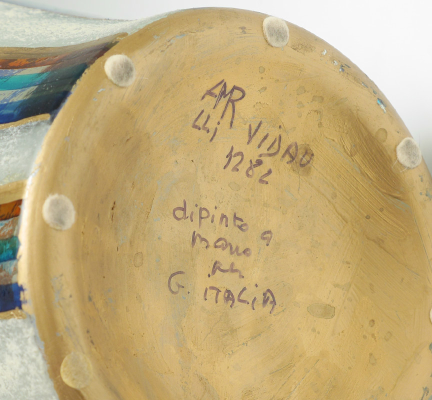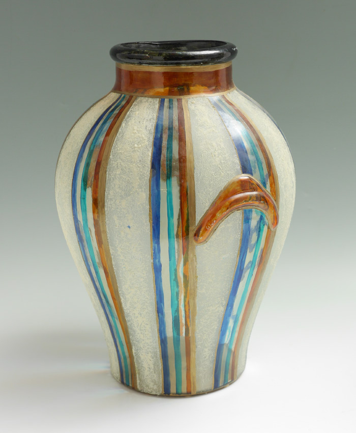 ITALIAN PAINTED ART GLASS VASE: Painted polychrome and textured vertical bands, embossed handles, inscribed ''Dipinto a Mario ??? G. Italia'' and ''FMR LLi Vidau 1282''. Overall measures 15 3/4'' h. x 10 3/4''.