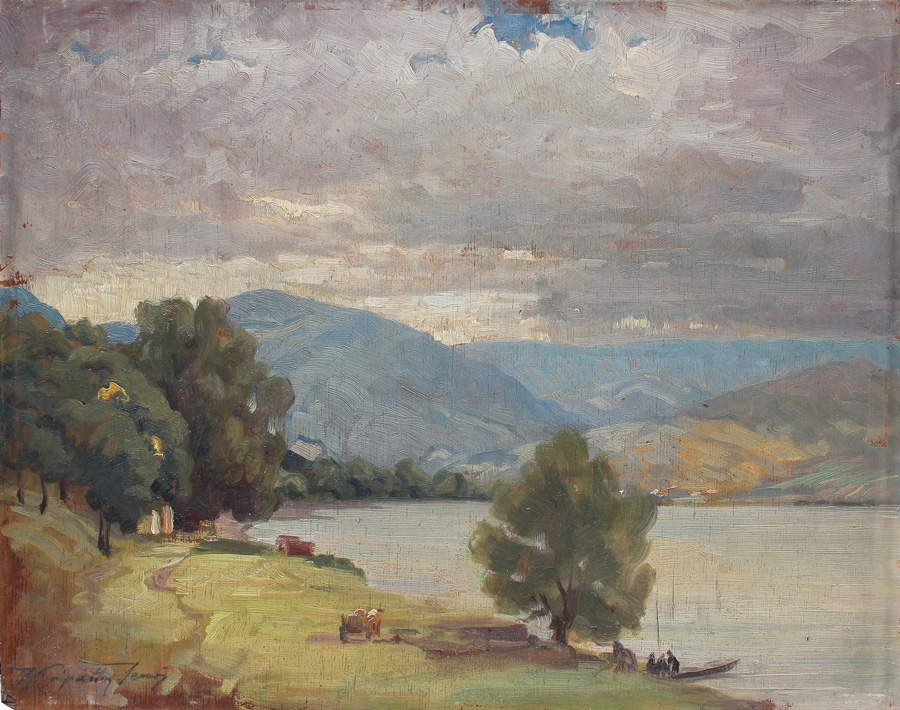 KARPATHY, Jenos, (Hungarian, 1871-1950): Hungarian Lakeside Scene, Oil on Board, 16'' x 19.75'', signed lower left, framed, 18.25'' x 22.5''. Karpathy was born in Hungary and studied in Budapest with Bertalan Skekely. He also studied in France, Brussels and Belgium. He is best known for his landscape paintings.