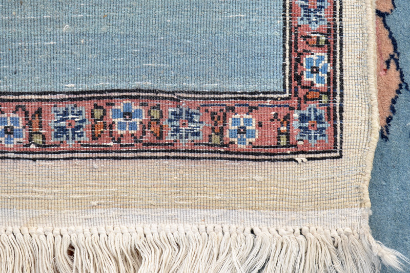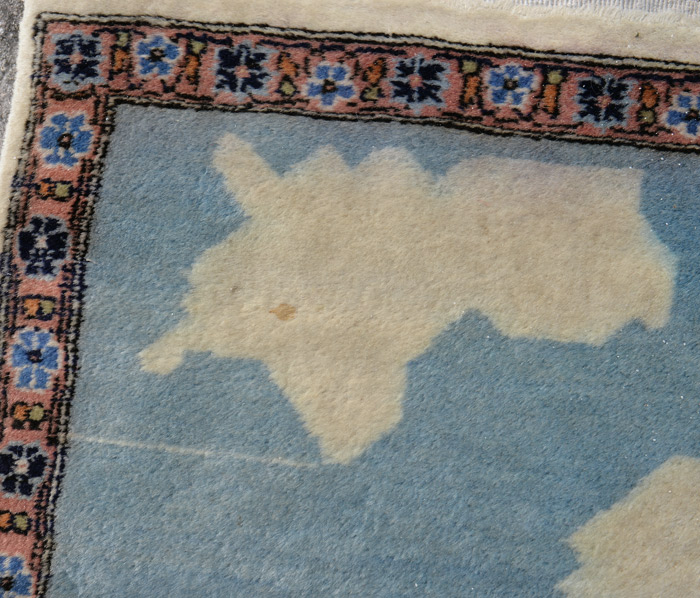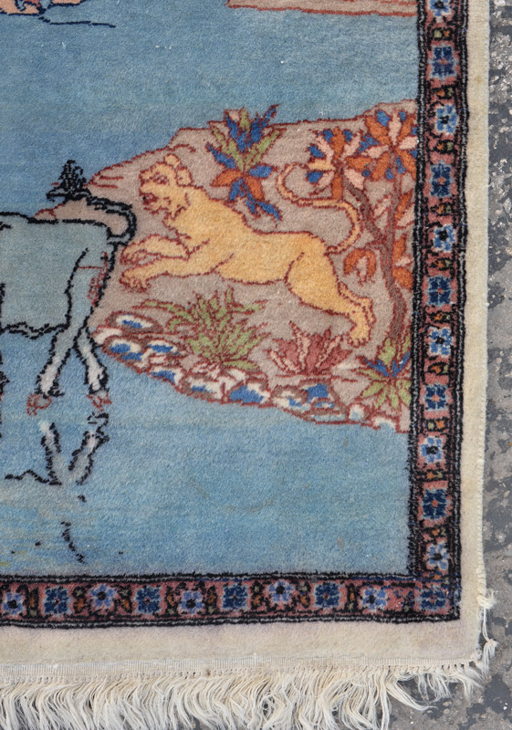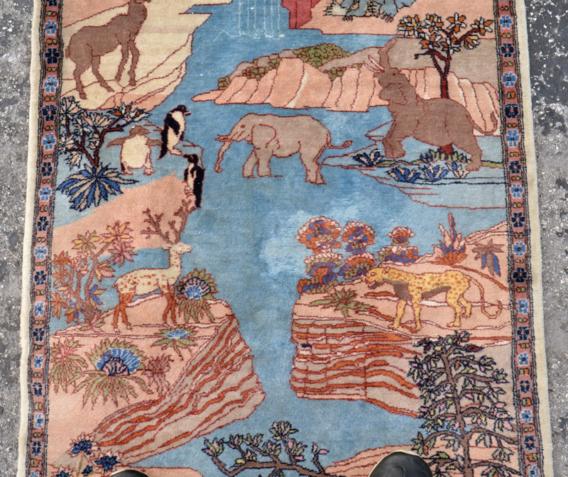 APPROX. 45-65 YR OLD PERSIAN KASHAN PICTORIAL HAND KNOTTED WOOL RUNNER, 2'6'' x 10': This rug has an unusual pictorial format that starts with a blue sky with clouds over a tall waterfall that becomes a river that flows the length of the runner. On islands or outcroppings of land on either side are found a variety of animals from all over the world. These include a polar bear, penguins, elephants, giraffes, monkeys, a lion, tiger, and leopard and more. The animal's images were probably derived from photos or books and their scale of size doesn't match the true size of the animals, but it adds to the charm of the rug.