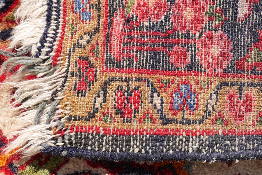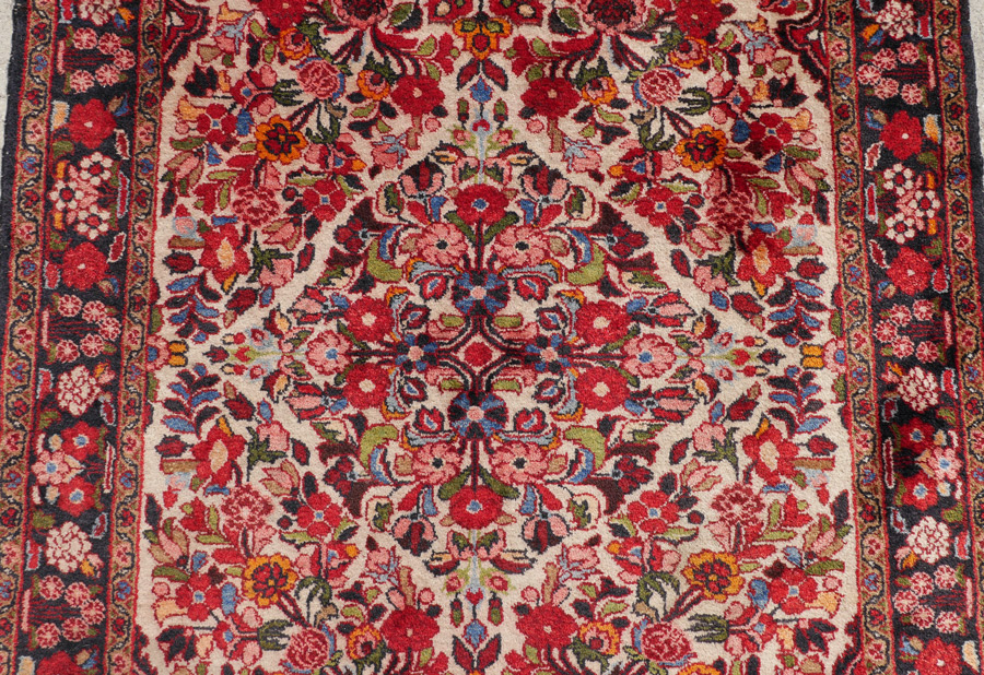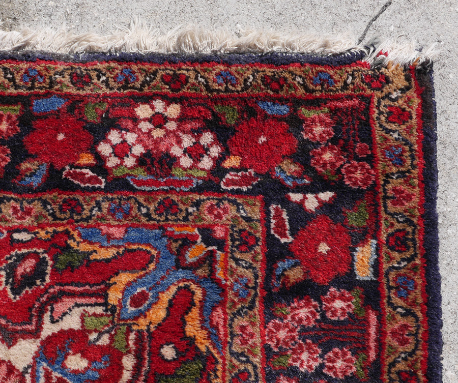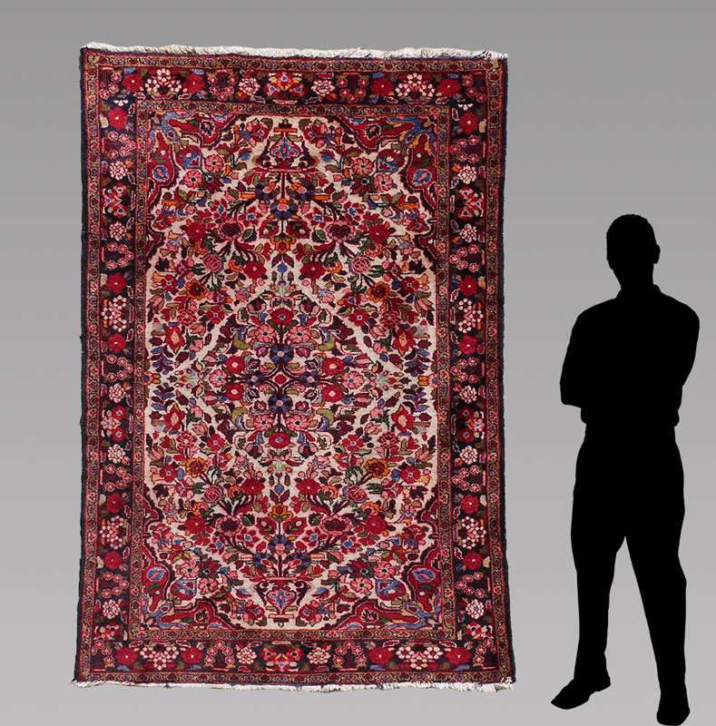 APPROX. 75-90 YR OLD PERSIAN BORCHALOU HAND KNOTTED WOOL RUG, 4'9'' x 7'6'': This is a very attractive example of a Persian village, Borchalou that is known for its cheerful, clear colors and it is well drawn designs. There is a central diamond shaped medallion and outer oval shaped designs that link to it. The red, blues, greens, and orange colored flowers are on an ivory field.