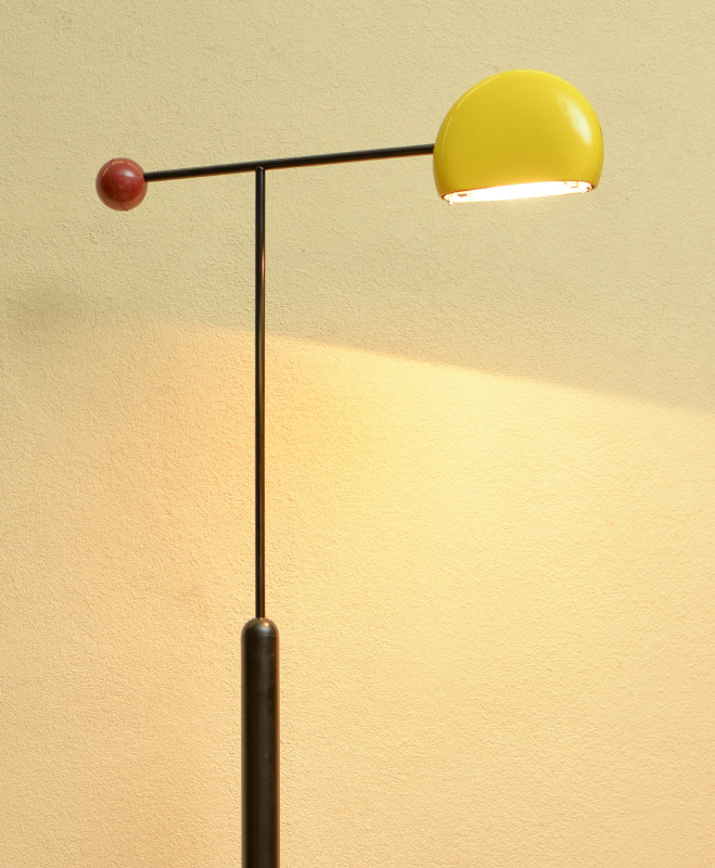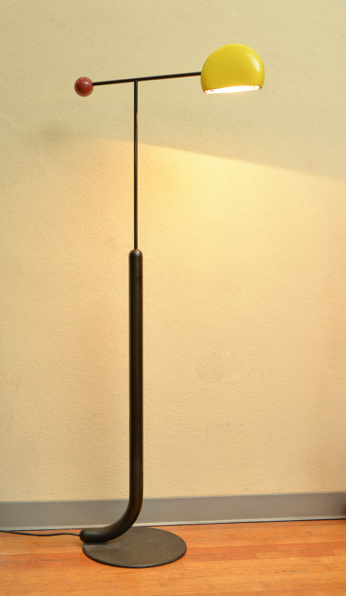 TOSHIYUKI KITA LUCI TOMO FLOOR LAMP: Designed by Japanese designer Toshiyuko Kita for Luci, modernist ''Tomo'' floor lamp. Adjustable black base, yellow enamel shade on halogen light fixture, red plastic ball at other end of boom arm. In lowest setting 54 3/4'' h. x 25''.