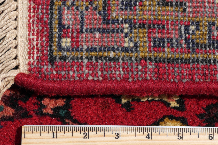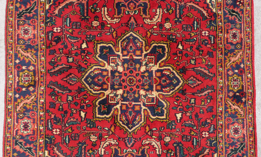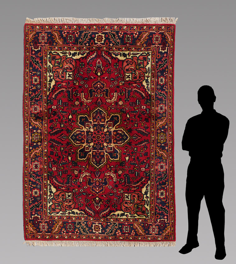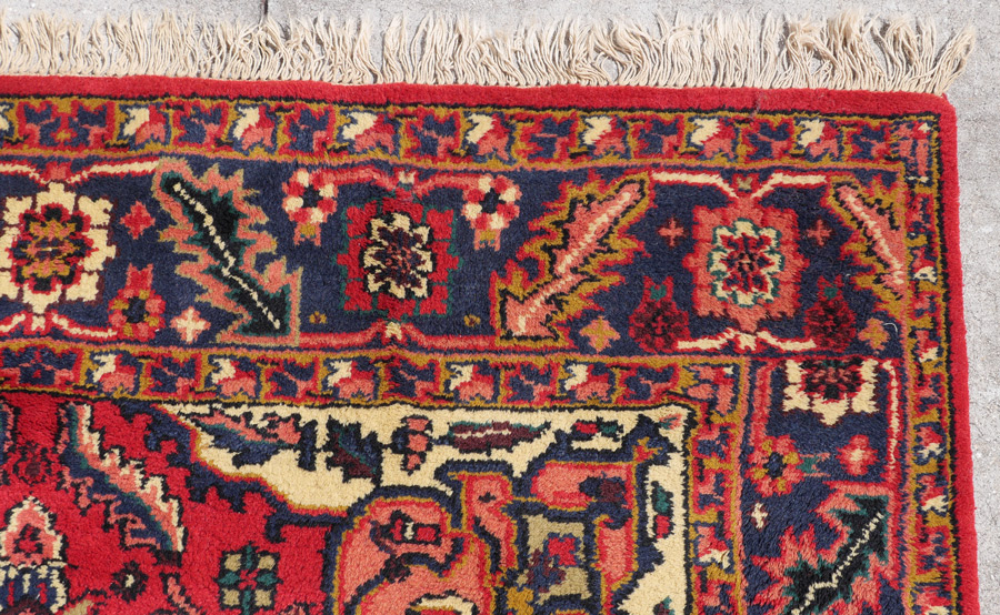 APPROX. 20-35 YR OLD INDO-PERSIAN HERIZ PATTERN HAND KNOTTED WOOL RUG, 5'8'' x 7'10'': This rug has a traditional Heriz pattern with a blue ground lobed central medallion outlined in ivory and with spandrels at either end. Vines with flower heads and leaves fill in the rest of the field. A serrated leaf and flower head design on the blue main border completes the rug. Condition is good.