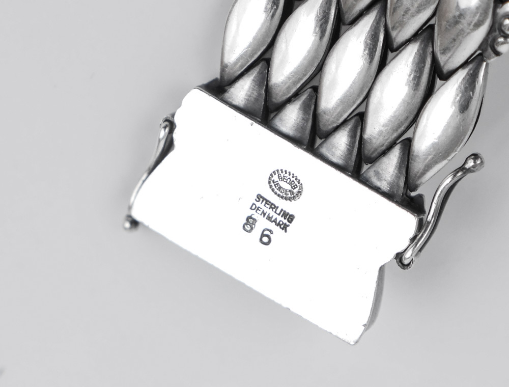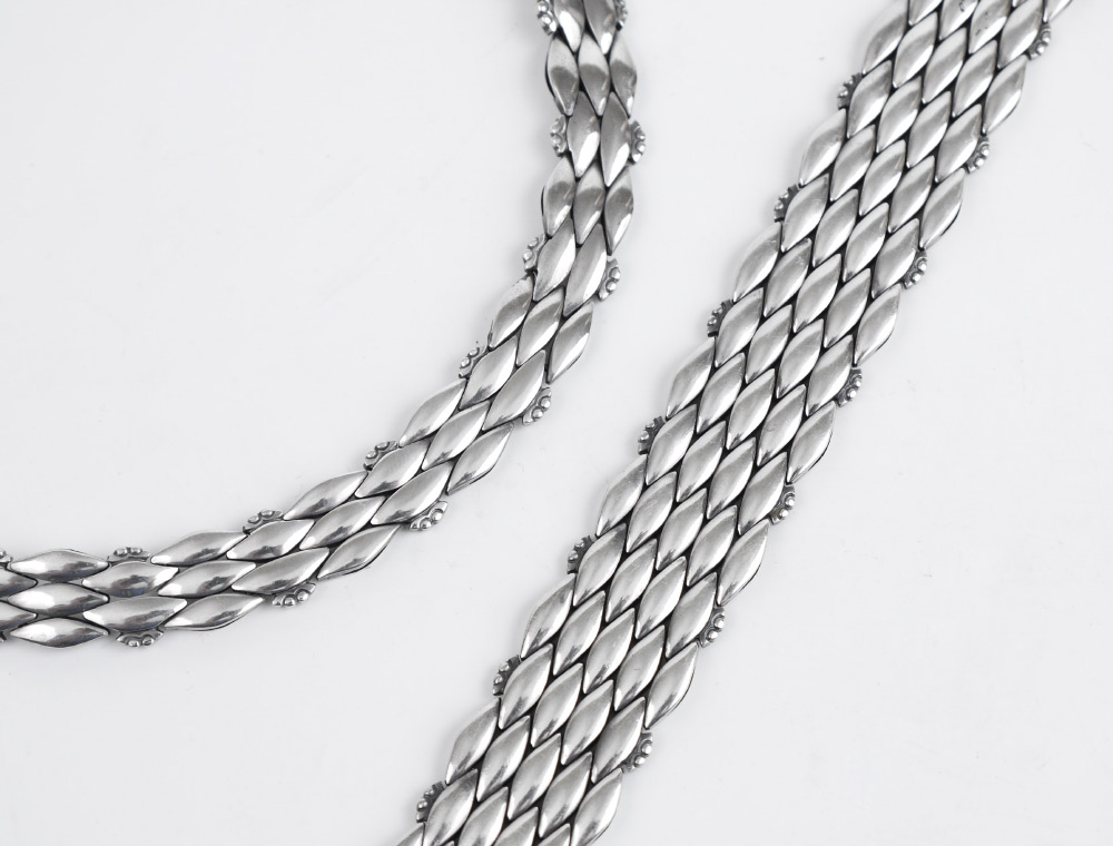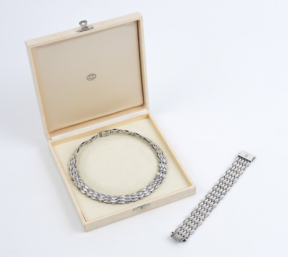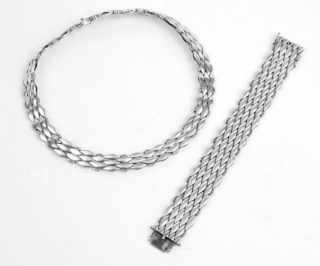 RARE GEORG JENSEN SILVER SUITE INC NECKLACE & BRACELET: Georg Jensen sterling bracelet and necklace suite designed by Harald Nielsen 1930's Denmark. Comes with original Georg Jensen box. Bracelet is 7.5'' long and .875'' wide. Necklace is 15.5'' long and .5'' wide. Correct stamps and marks. Total weight 5.11 Troy ounces.