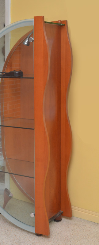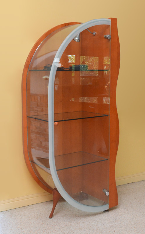 CONTEMPORARY DISPLAY CABINET: Shaped case, glass door and bowed glass side, illuminated interior with 3 glass shelves, wood ball feet and spindle leg. Purchased in 2003 as a ''Totem Cupboard Left'' from Diamond Furniture Gallery for $650. Overall measures 61 1/2'' h. x 26 1/2'' x 16 1/2''.