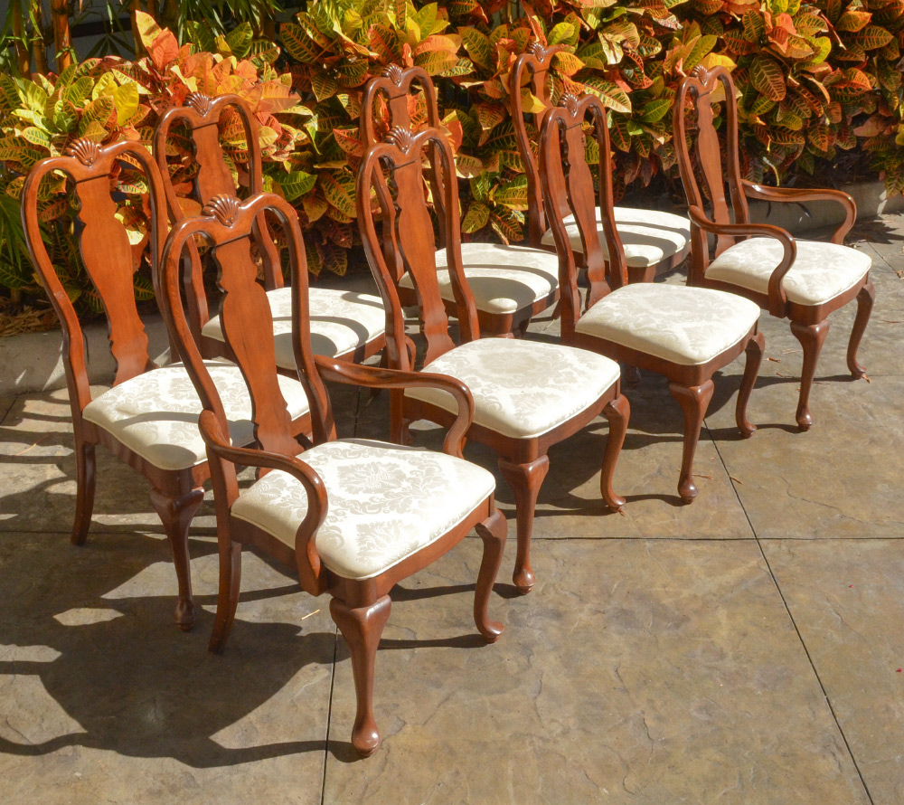 8 BERNHARDT ELEGANT DINING ROOM CHAIRS: Queen Anne style dining chairs with shaped backs, shell crest, cabriole legs, white floral upholstered seats. The 2 arm chairs measure 41'' h. x 21 3/4'' x 24 1/2''.