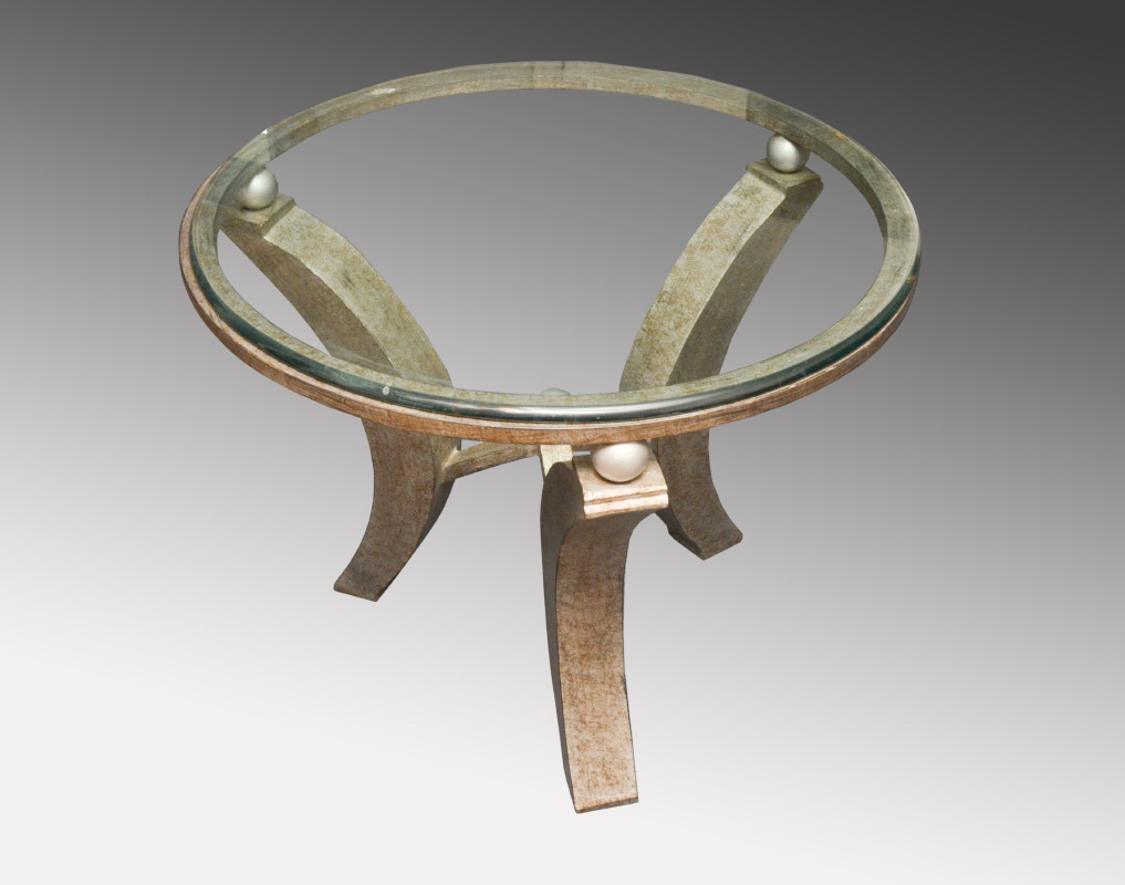 MODERNIST METAL AND GLASS SIDE TABLE: 3 patinated steel leg modernist design occasional table with glass top. Overall measures 25'' h. x 30'' dia.