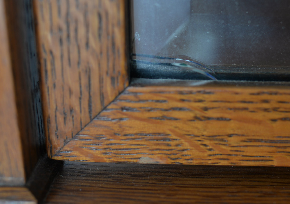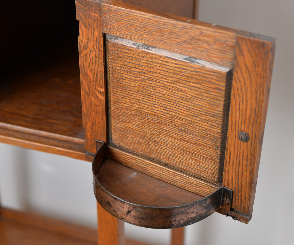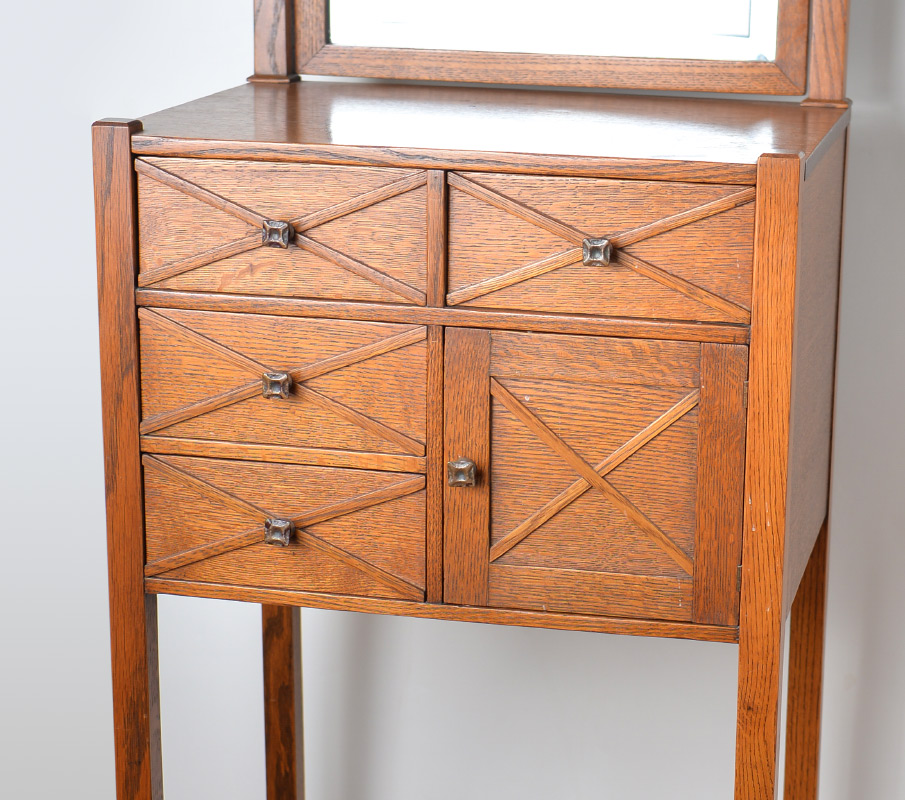 ARTS AND CRAFTS STYLE SHAVING STAND WITH MIRROR: Panel mirror over arts & crafts style chest with 4 drawers and a door, straight legs, open lower stretcher shelf. Overall measures 66 1/4'' h. x 20 3/4'' x 17''.