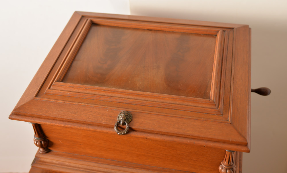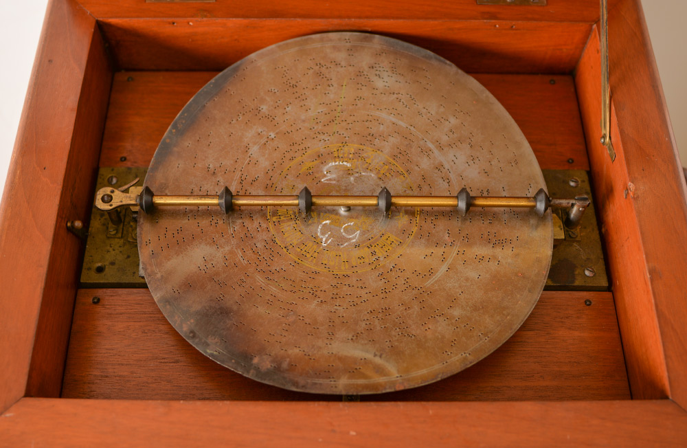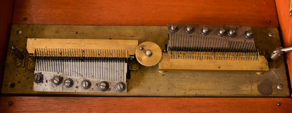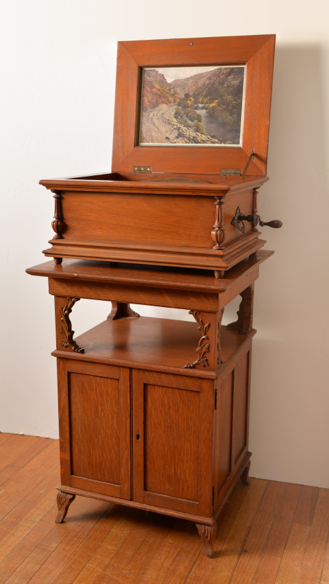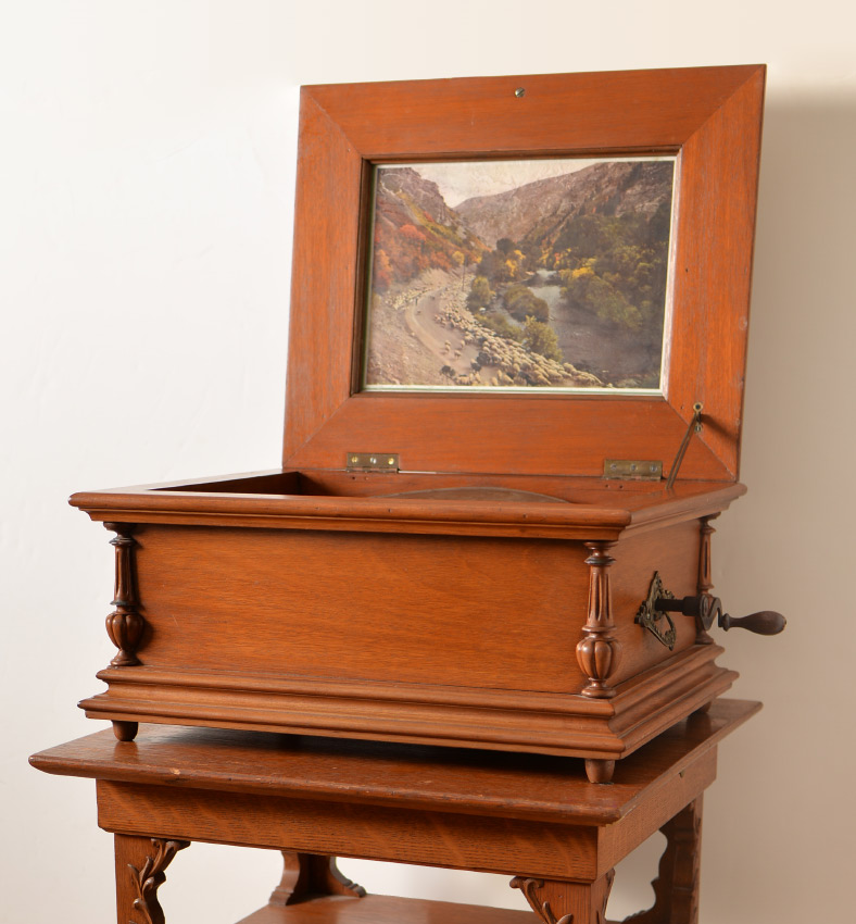 CONDITION: Symphonium currently working, not guaranteed to continue. Scratches and wear to top of stand. Other wear consistent with age and use.