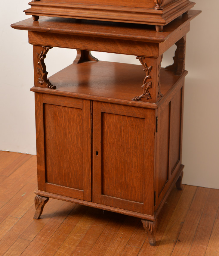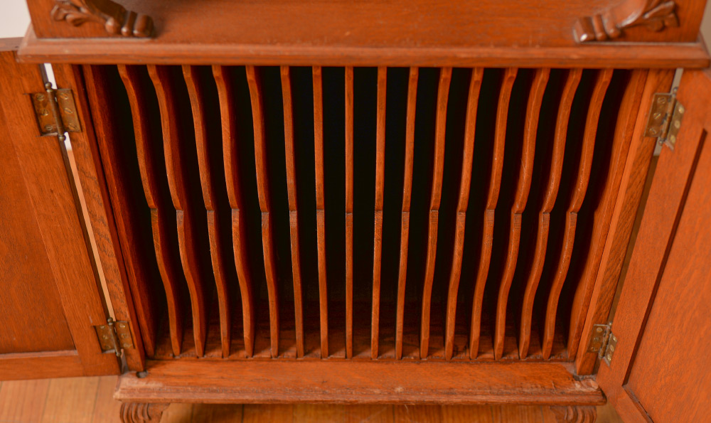 SYMPHONIUM DISC MUSIC BOX WITH ORIGINAL STAND: Walnut case with hinged lid, carved and fluted 3/4 columns at corners, interior of lid with chromolithograph. Double comb marked with Symphonium Schutze-Marke, Trade-Mark, serial number 230335, plays 13 5/8'' discs. Sold with an oak music stand, carved supports under top, base with 2 doors and vertical slats for disc storage. Symphonium overall 11'' h. x 22'' x 18'', stand 32'' h. x 23''.