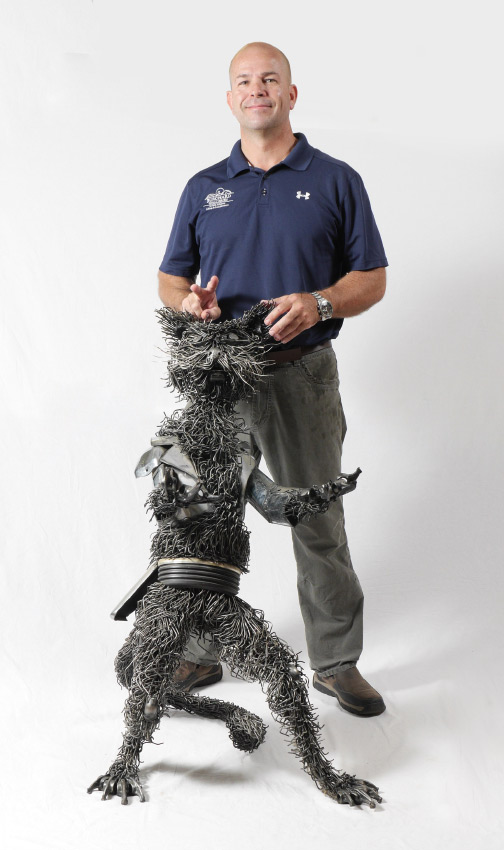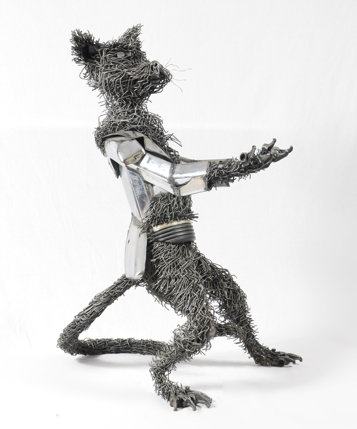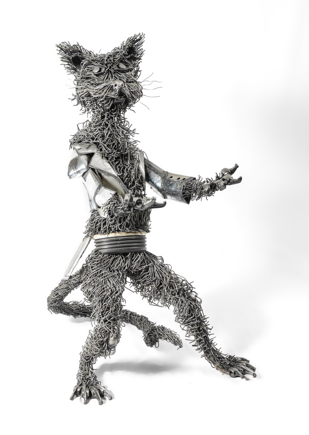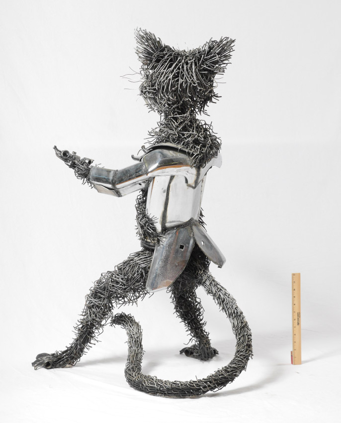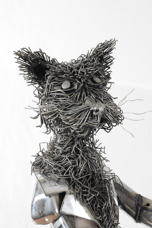 PAUL EPPLING CAT SCULPTURE: Constructed from chain link fencing and bumper and motor rockers from a car, signed on right arm, 43''h. x 26''w. x 31''. CONDITION: Current tray is replacement glass daisy plate; original tray was shade of a street light.