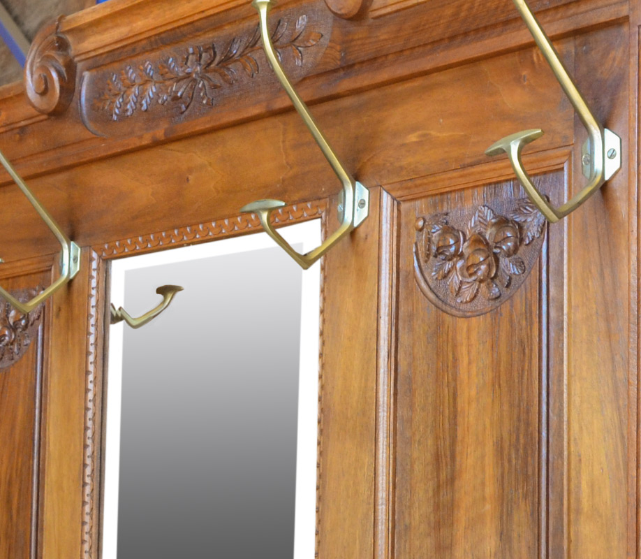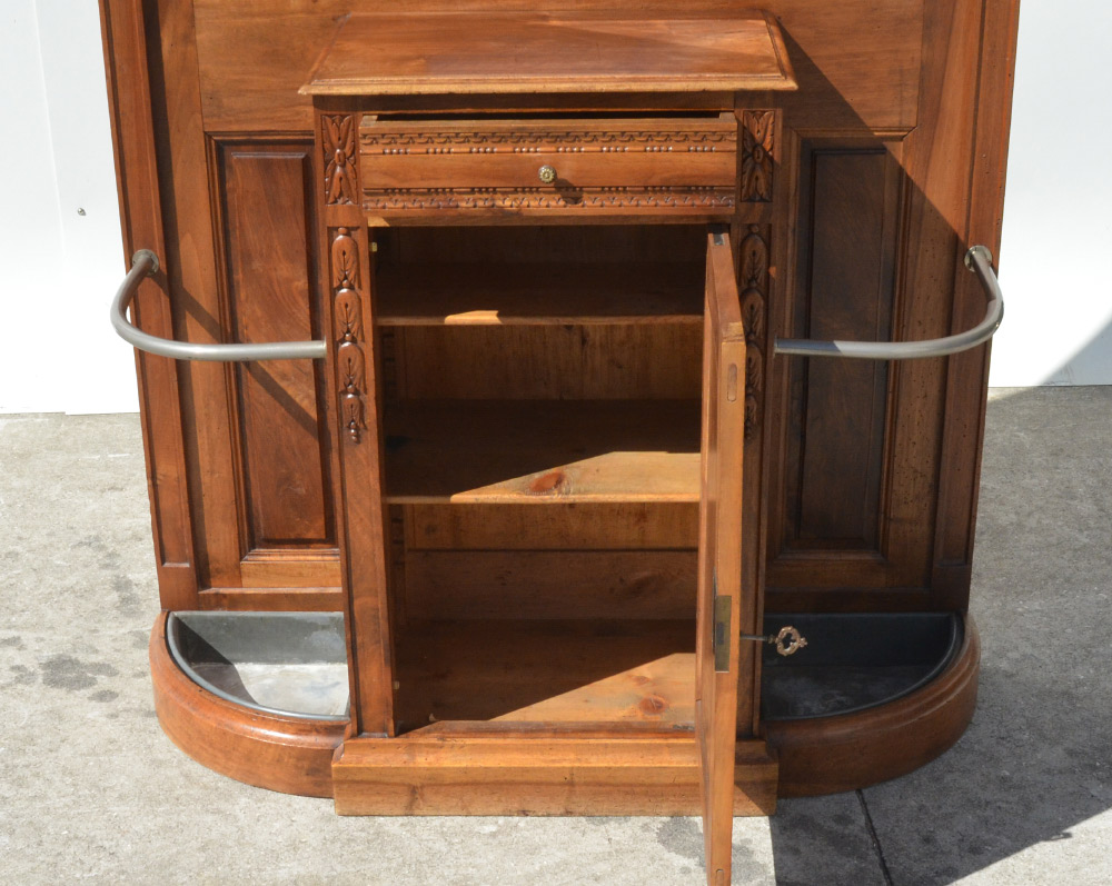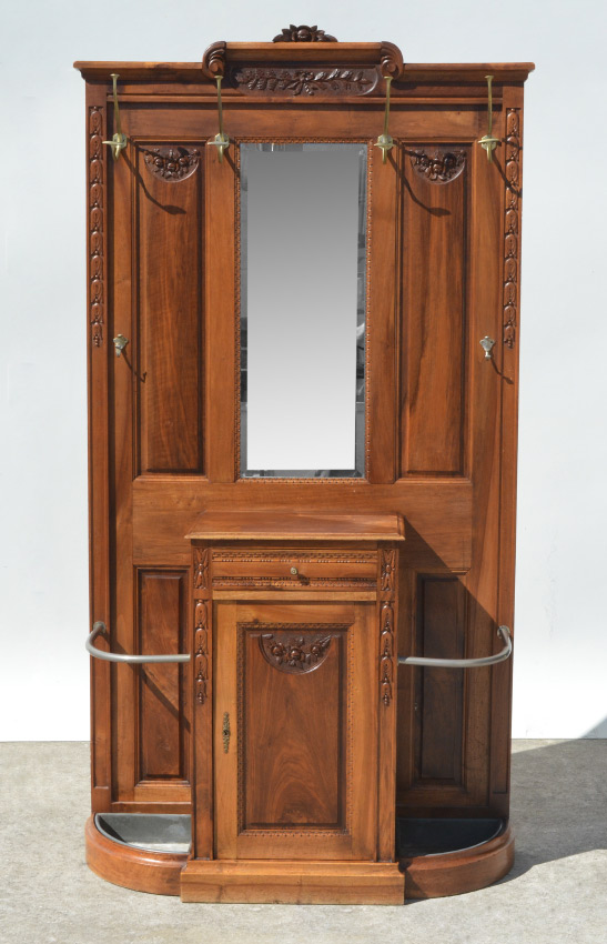 CARVED VICTORIAN WALNUT HALL TREE: Carved floral crest and bellflowers on sides, center beveled glass mirror over single drawer over single door, curved side umbrella stands with inserts. Overall measures 84'' h. x 45 1/2'' x 15''.