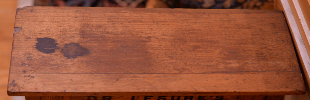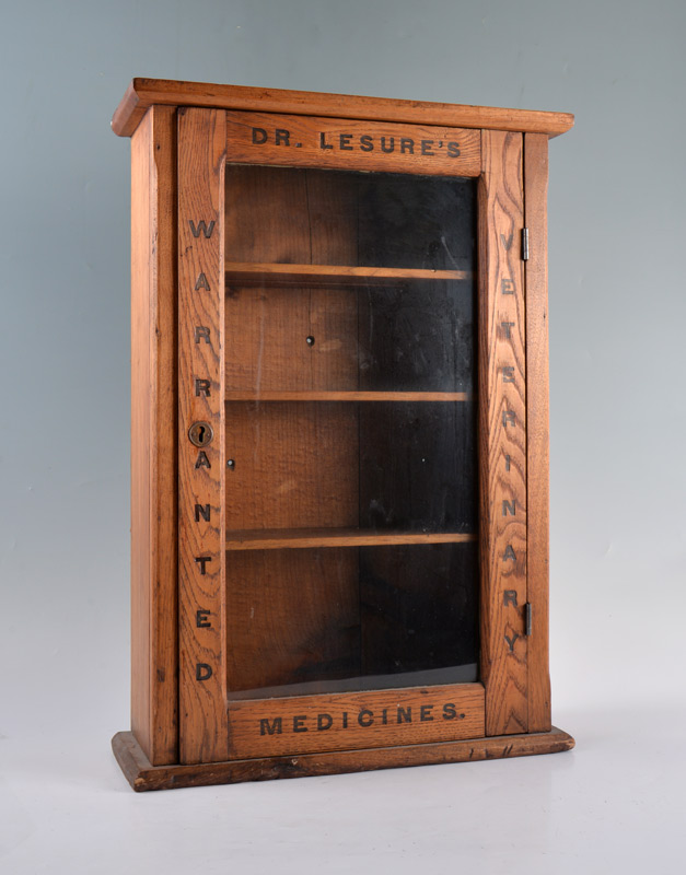 DR LESURE'S WARRANTED VETERINARY OAK MEDICINE CABINET: Single glass door cabinet with advertising inscription and 4 shelf interior, 25'' x 17 1/4''.