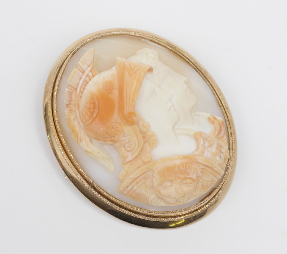 14K NEOCLASSICAL-STYLE CAMEO ARES & ATHENA: Carved soft shell cameo portrait of Ares and Athena set in a 14K yellow gold pin / pendant. Measures 2'' wide x 2.5'' high and .6625'' deep. Total weight 28.4 grams.
