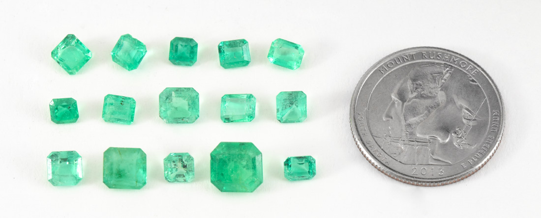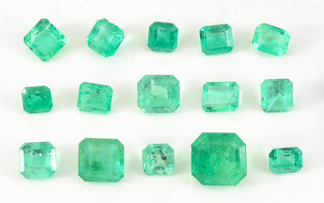 11.00 CTW LOOSE EMERALDS: Lot of 15 loose emeralds. Total weight 11.00 Ct. Approx. Range from VS-SI in clarity, G in Hue, 3-4 in Tone and 3 in Saturation.