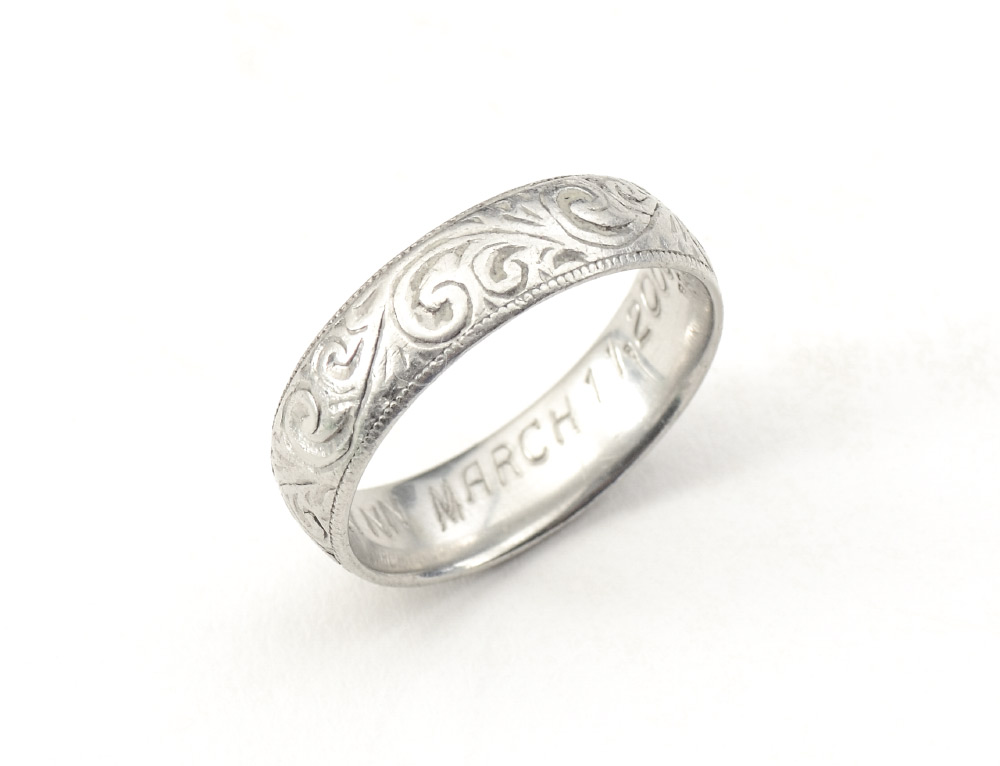 PLATINUM WEDDING BAND FROM BROWN & NEWIRTH: Hand engraved by iconic London based Brown & Newirth. 7MM wide, engraving inside band, well marked. Size 9. Total weight 8.9 grams.