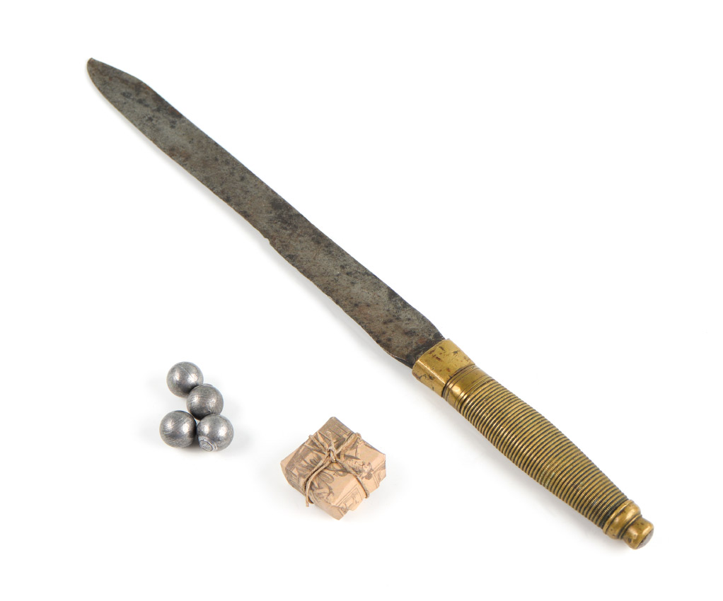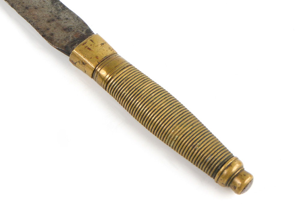 CIVIL WAR ERA CONFEDERATE? SIDE KNIFE: Crudely constructed with all brass hilt possibly from an 1840 N.C.O. sword, period 11 1/4'' blade, no visible markings. Overall measures 16 1/2'' long. Sold with 4 reproduction musket balls.