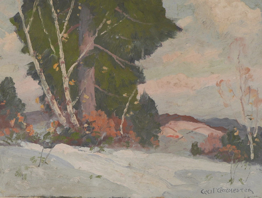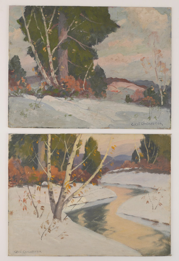 CHICHESTER, Cecil, (American, 1891-1963): 2 Lots to include 1) Winter Landscape with Stream, Oil on Canvasboard, 11.75'' x 15.75'', signed lower left, unframed; 2) Snowy Winter Landscape, Oil on Canvasboard, 12'' x 15.875'', signed lower right, unframed. Chichester was known for his landscapes and illustrations. In the 1930's, he was an illustrator for the Pierce Arrow Roadster company. Provenance: Estate Collection of Christian Buchheit.