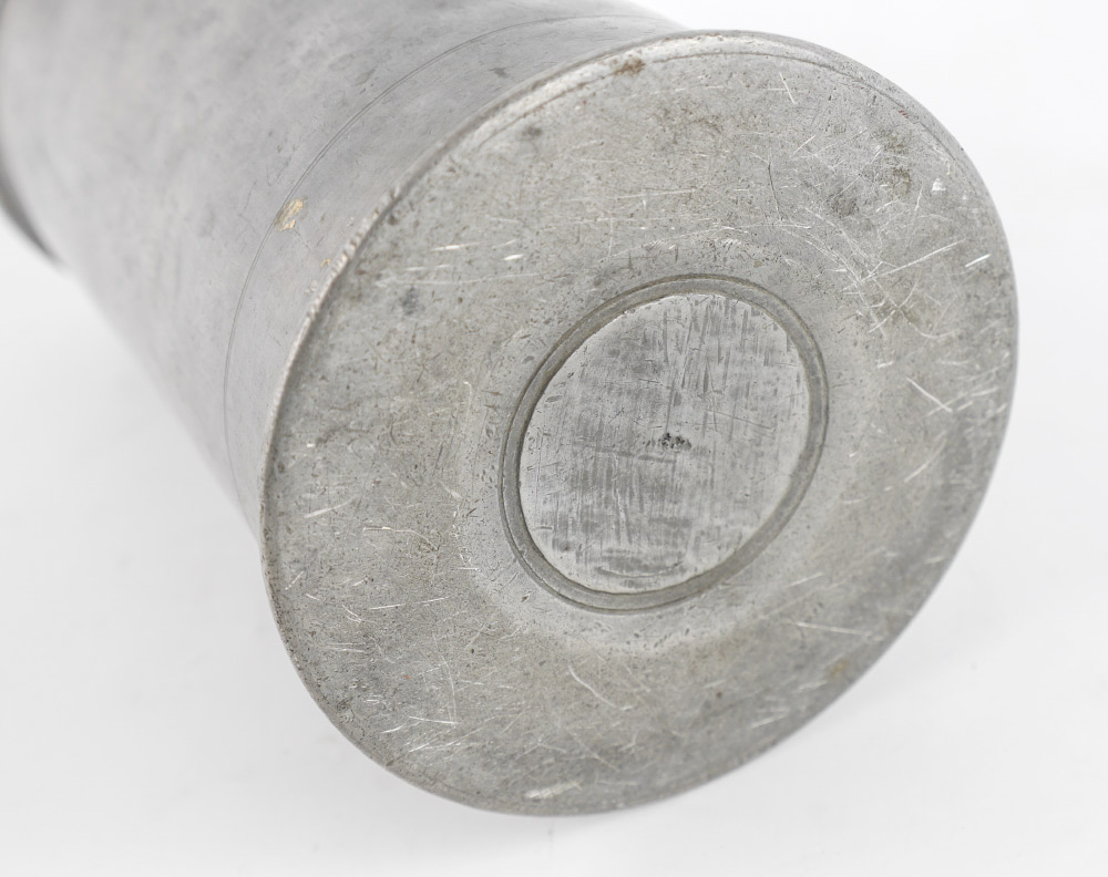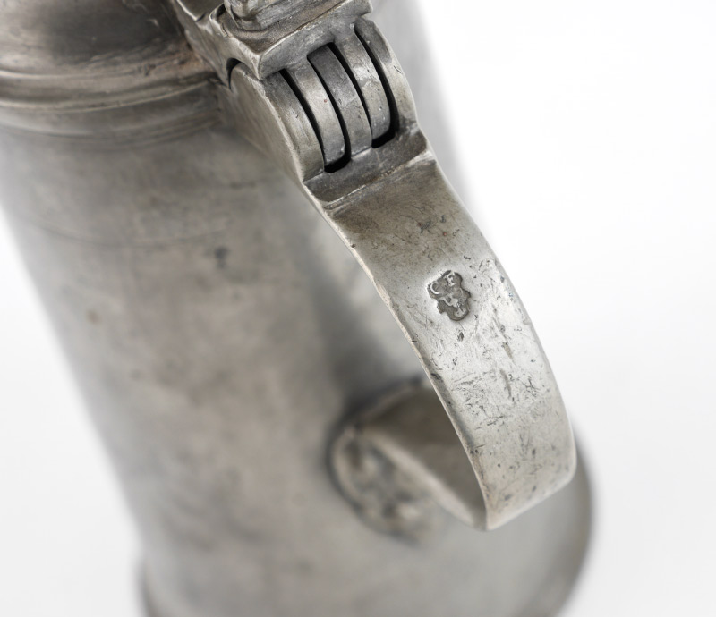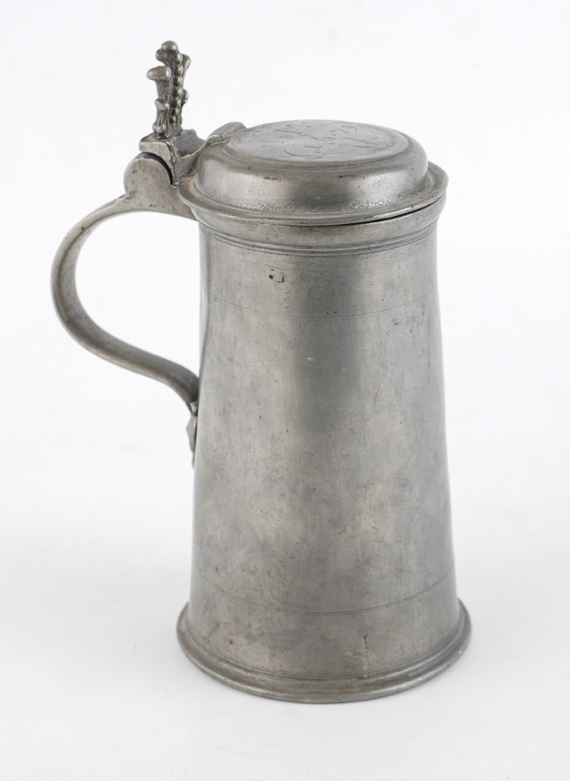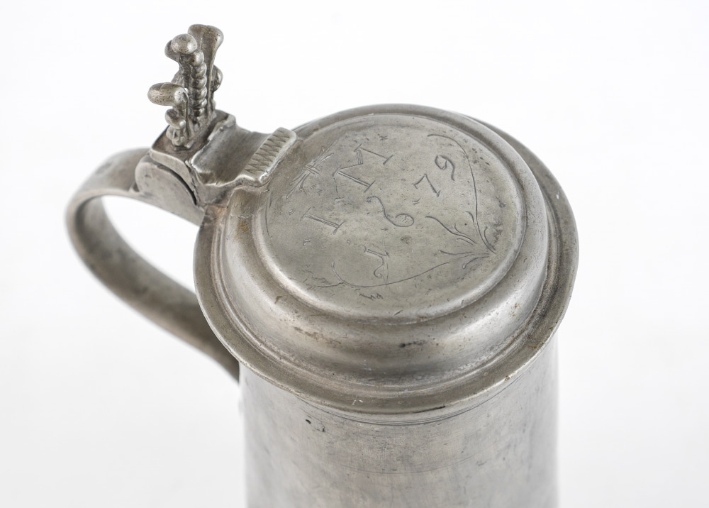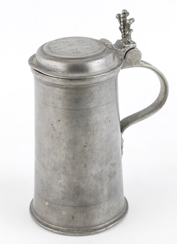 17TH CENTURY PEWTER TANKARD: Unidentified touchmark with CF on handle, lid inscribed with owner's initials I.M. 1679, overall measures 10 1/4'' h. x 7 1/2''.