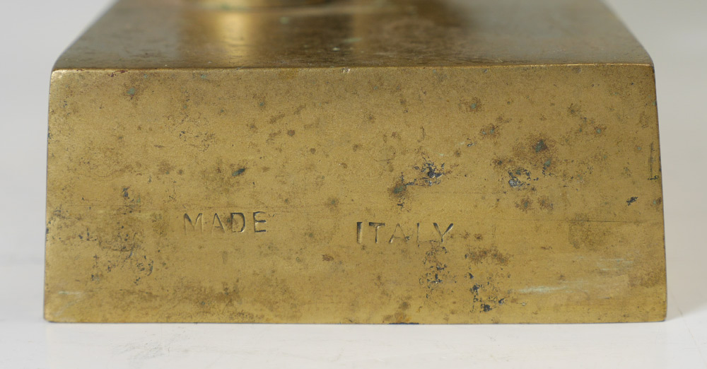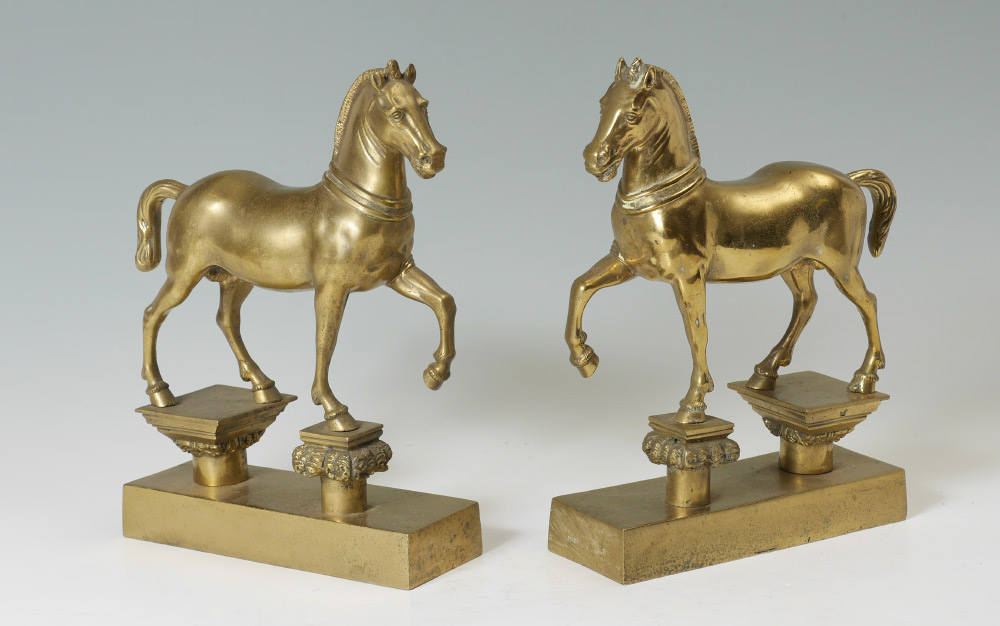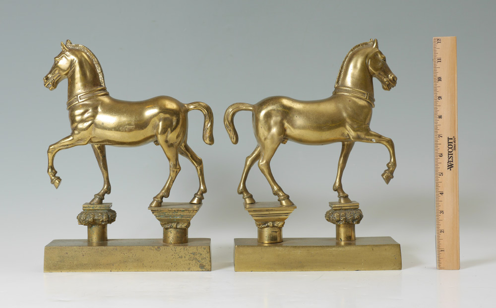 PAIR ITALIAN BRASS FIGURAL HORSE BOOKENDS: Heavy cast brass with one hoof up, marked Made Italy. Measure 12 1/4'' h. x 8 3/4'' x 3 1/4''.