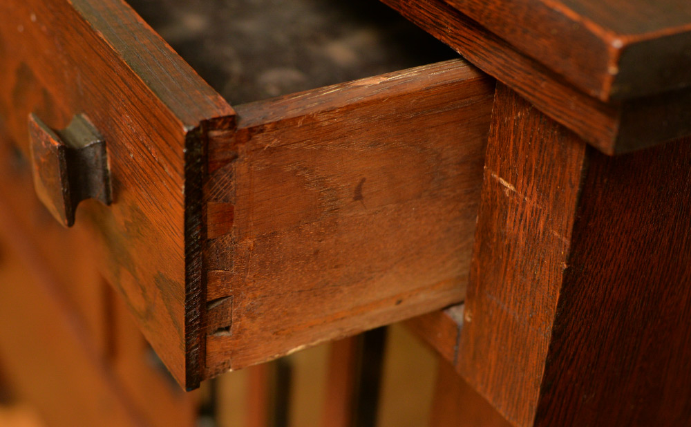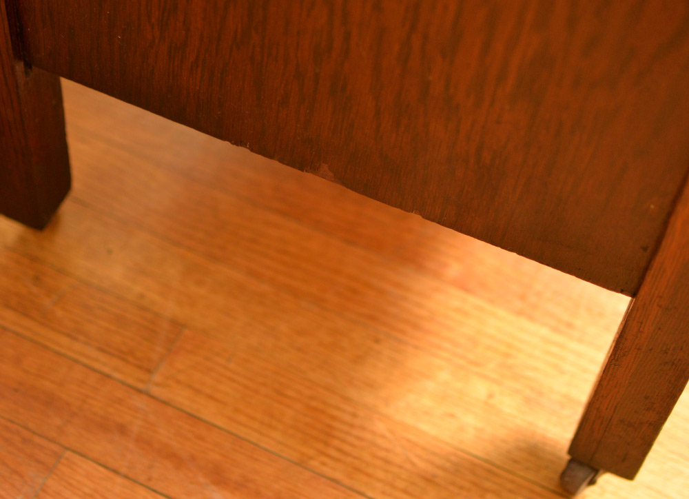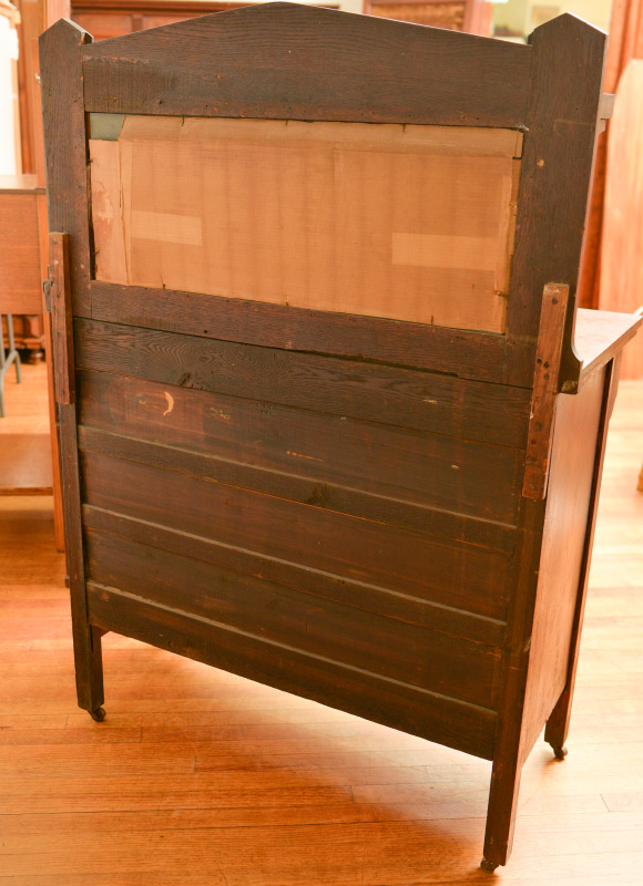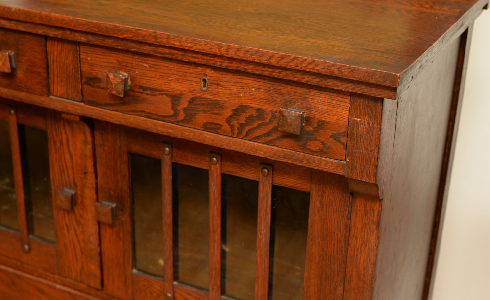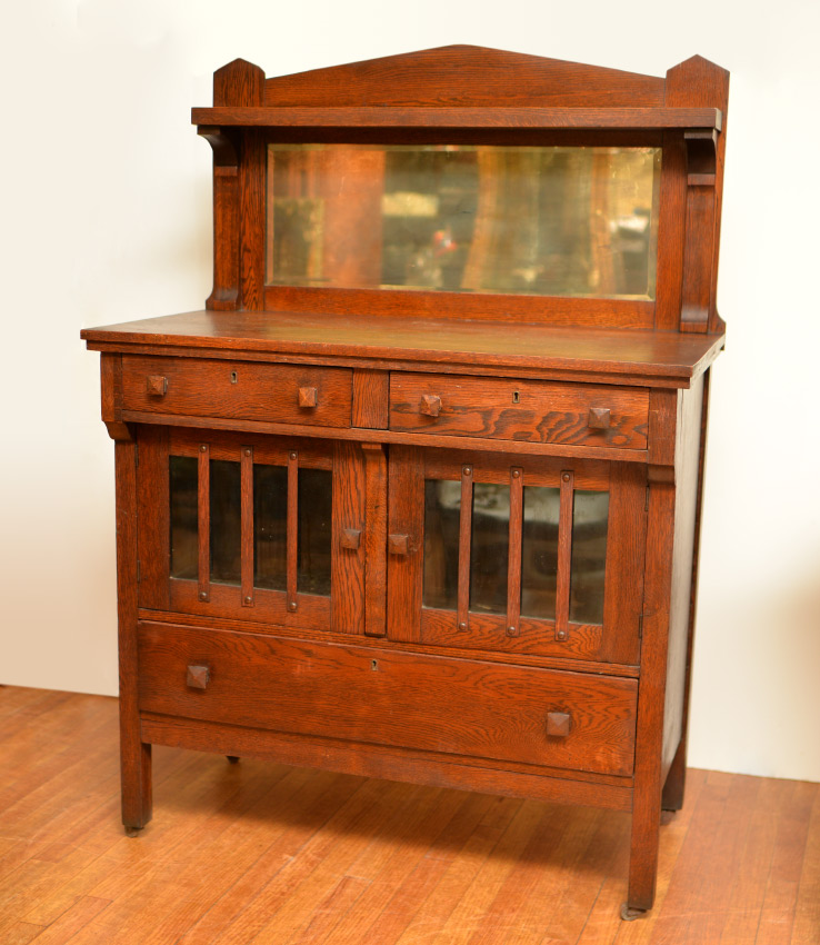 ARTS & CRAFTS OAK SIDEBOARD: Arched crest over shelf, mirrored backsplash, 2 drawers over 2 glass doors with slats over single full length drawer. Straight legs on castors, overall 60'' h. x 42'' x 22''.