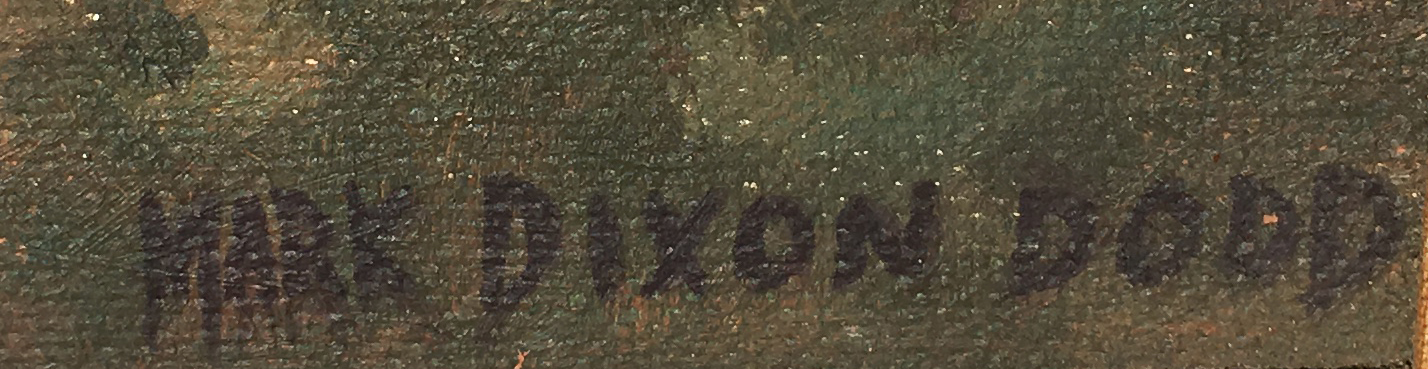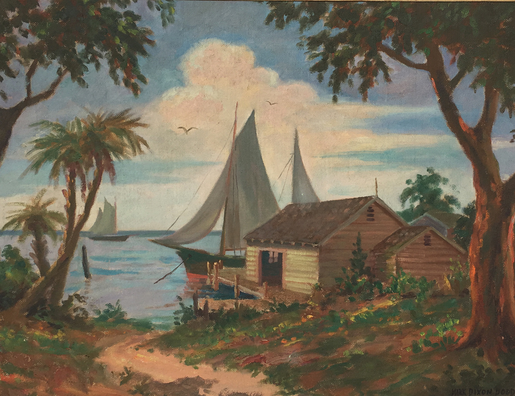 DIXON DODD, Mark, (American, 1888-1952): Tropical Waterside Scene with Boats at Dock, Cottages and Palm Trees, Oil on Masonite, 27'' x 33'', signed lower right, carved wooden frame, 35.5'' x 41.5''. Dodd was an architect and an artist. While living in the Tampa Bay area, he designed homes and presented his paintings of the home to each new owner.