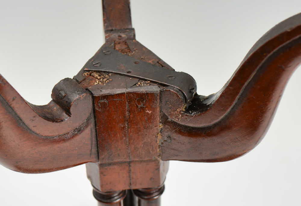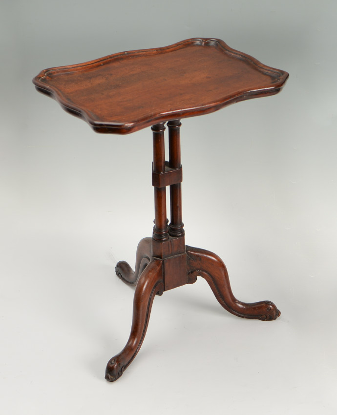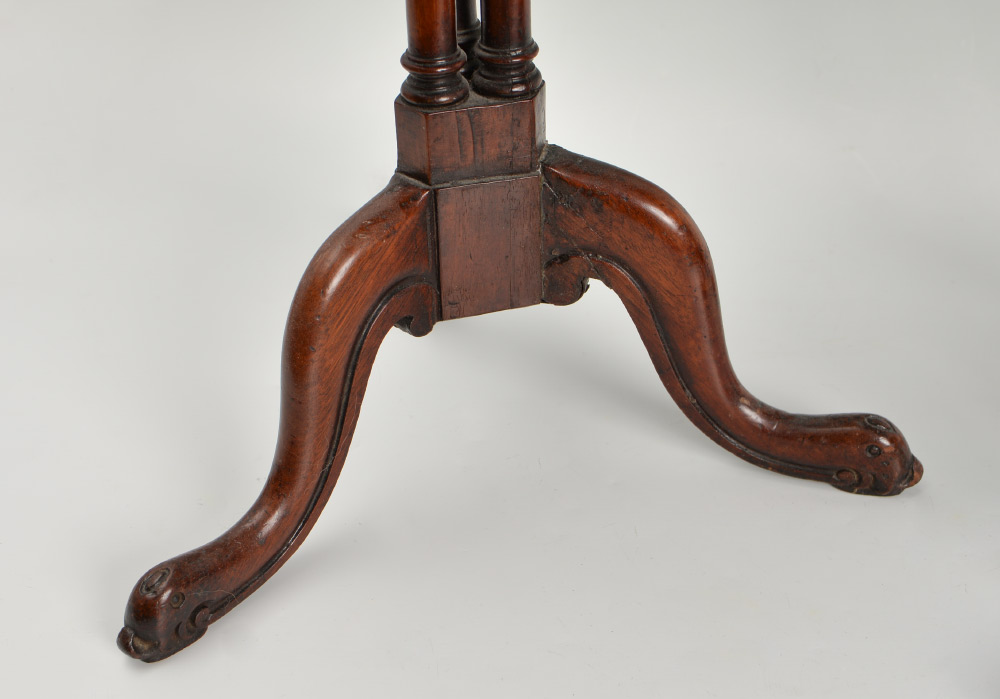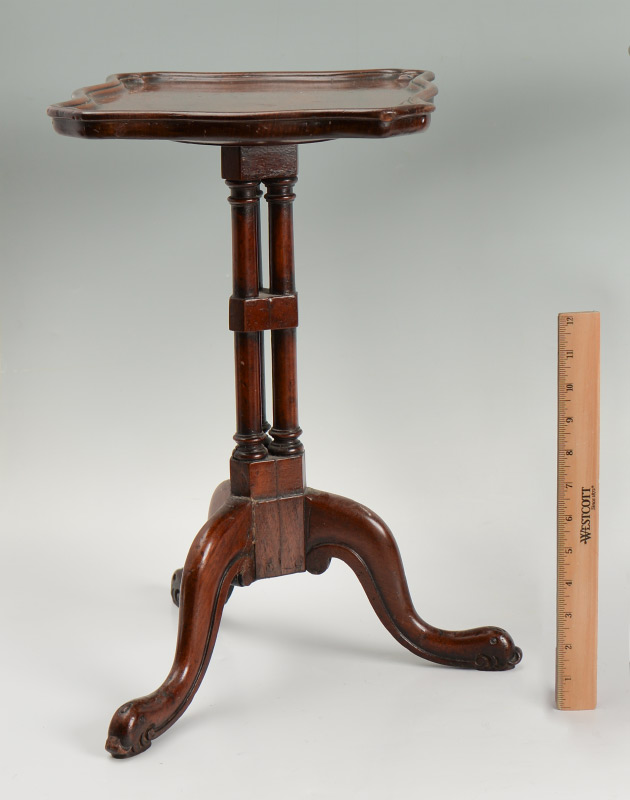 CHIPPENDALE STYLE MAHOGANY DOLPHIN FOOT CANDLE STAND: Possibly Philadelphia, sculpted top, three Corinthian column support, over three splayed legs ending in carved stylized dolphin masquerons. Overall measures 18 1/4'' h. x 14'' x 10 3/4''.