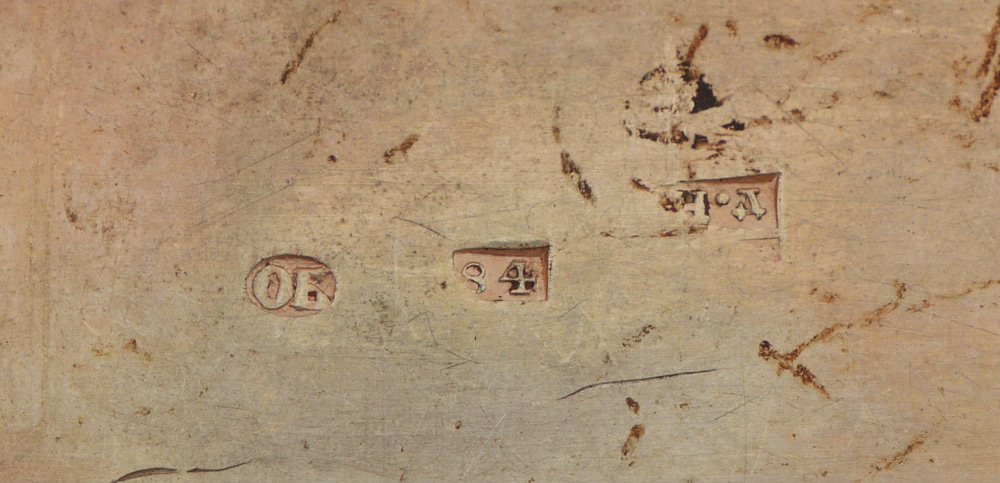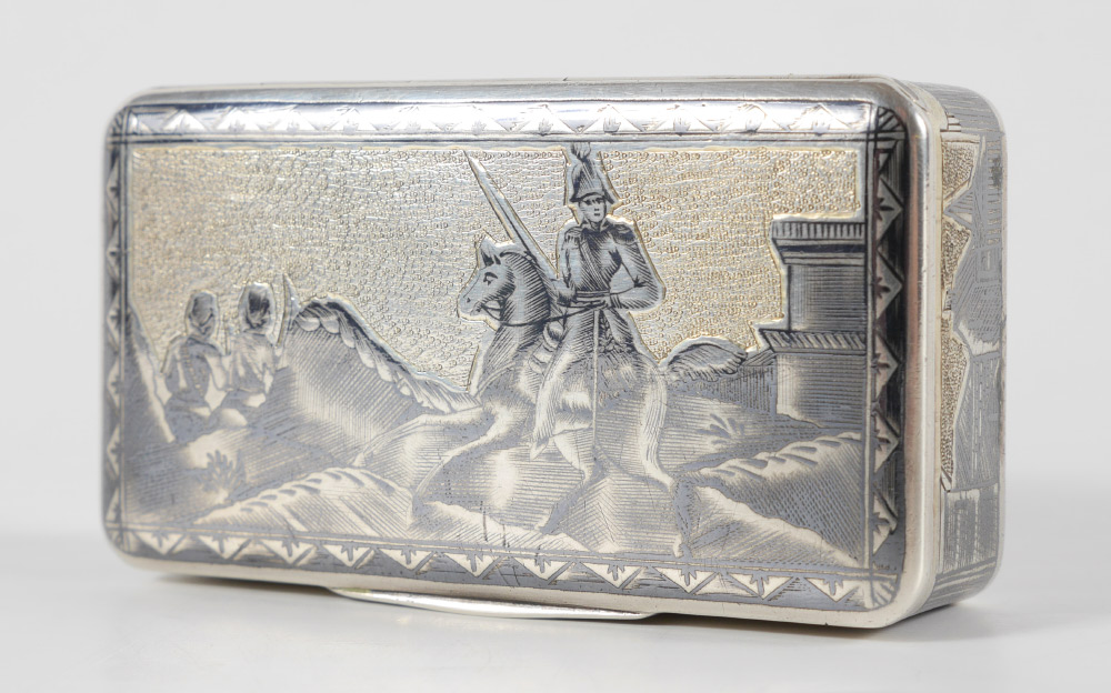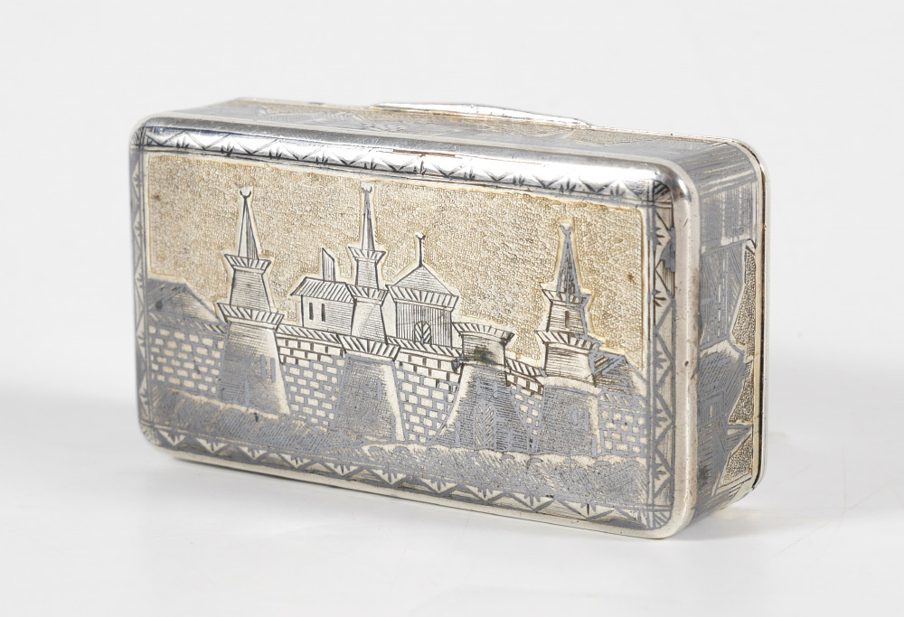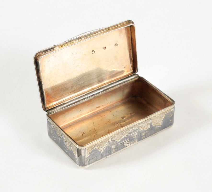 RUSSIAN SILVER NIELLO ENGRAVED SNUFF BOX: Niello engraved decorated box, hinged lid with soldiers, sides and bottom with town elevation scene. Marked with unknown maker OE in circle, illegible town marks. Overall measures 3'' x 1 1/2'' x 1''. Approx. 3.0 troy oz.