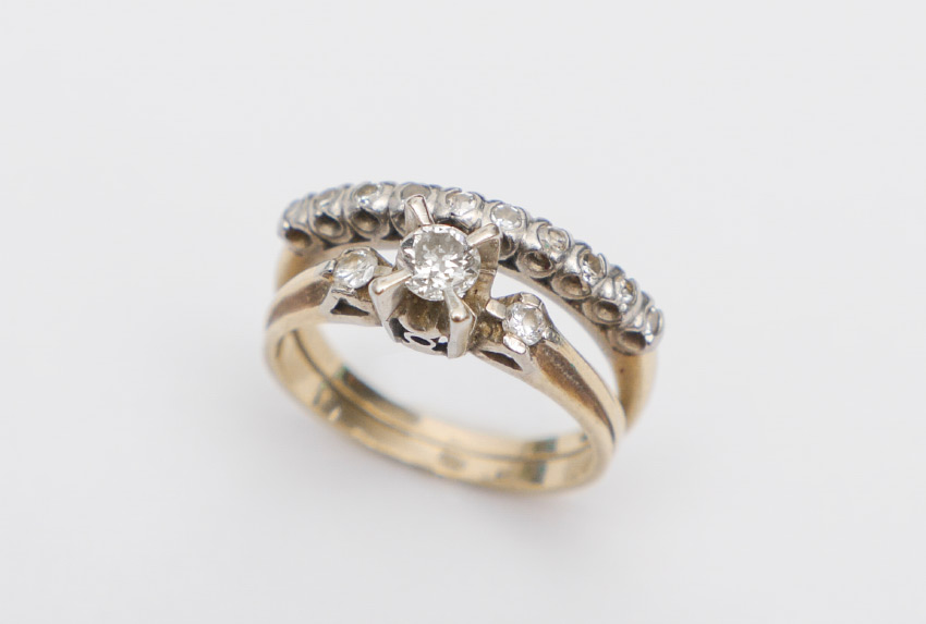 14K .50 CTW BRIDAL SET: 14K yellow gold bridal set contains 3 round brilliant cut diamonds and 10 round single cut diamonds. Bear measures Weight: .50 Ct. Approx. Rated SI in clarity and H-I in color. The diamonds are prong set. Size 5.5. Weight: 4.6 grams.