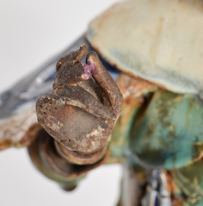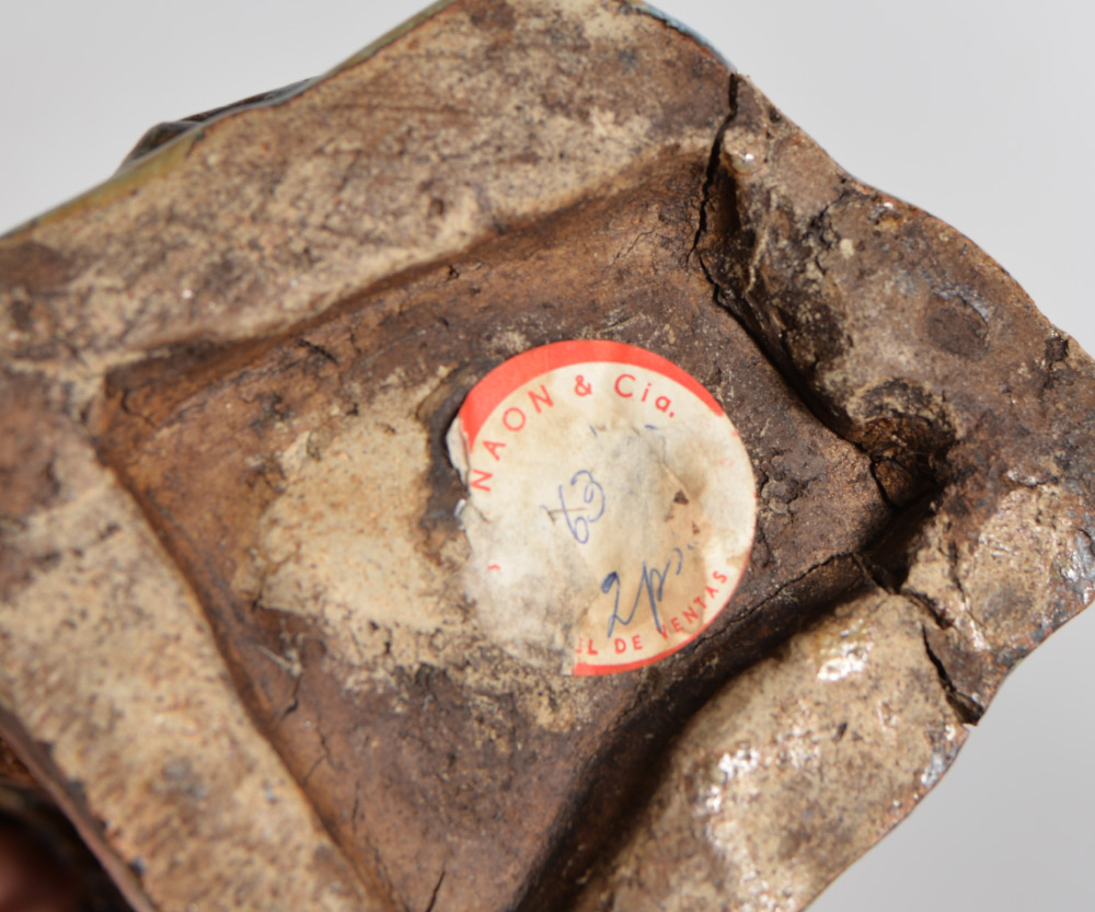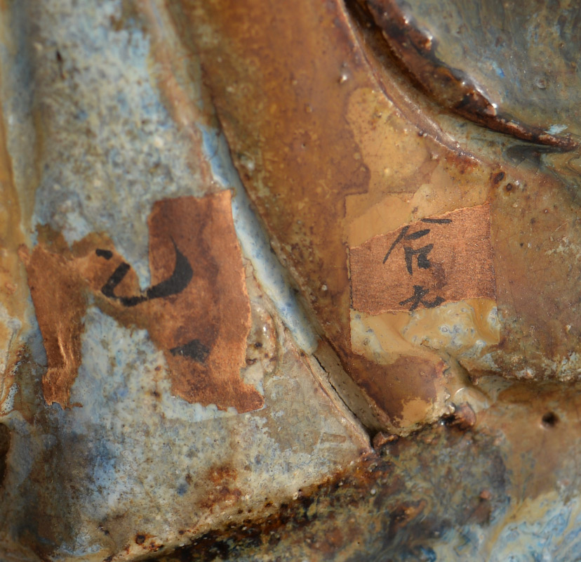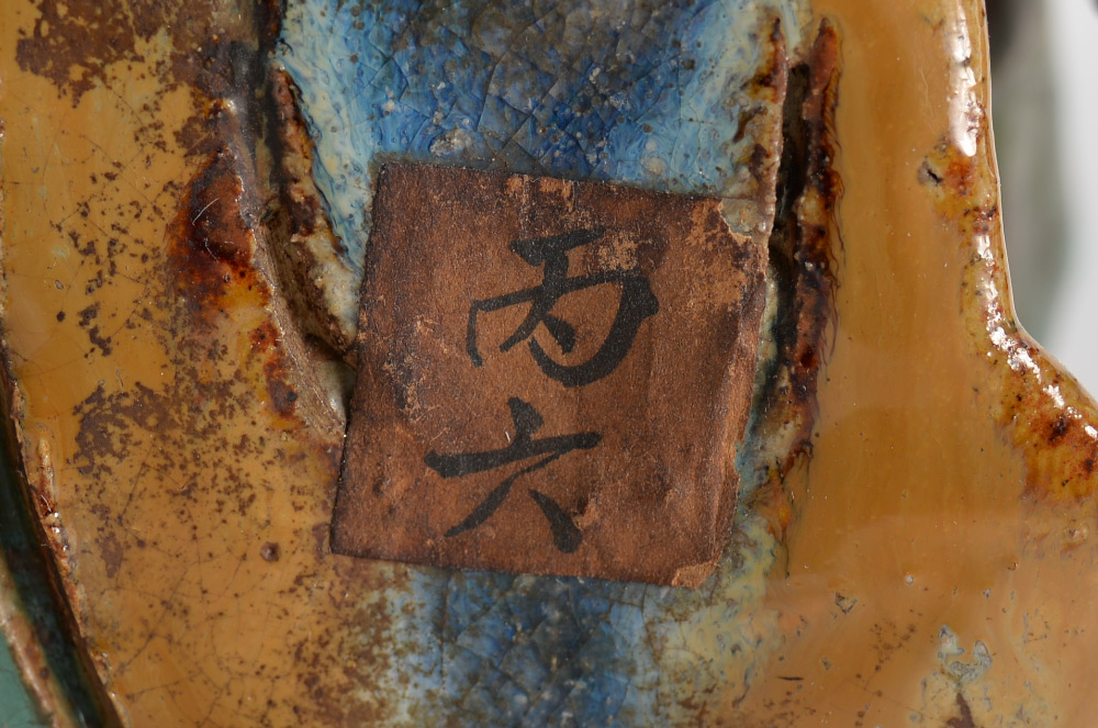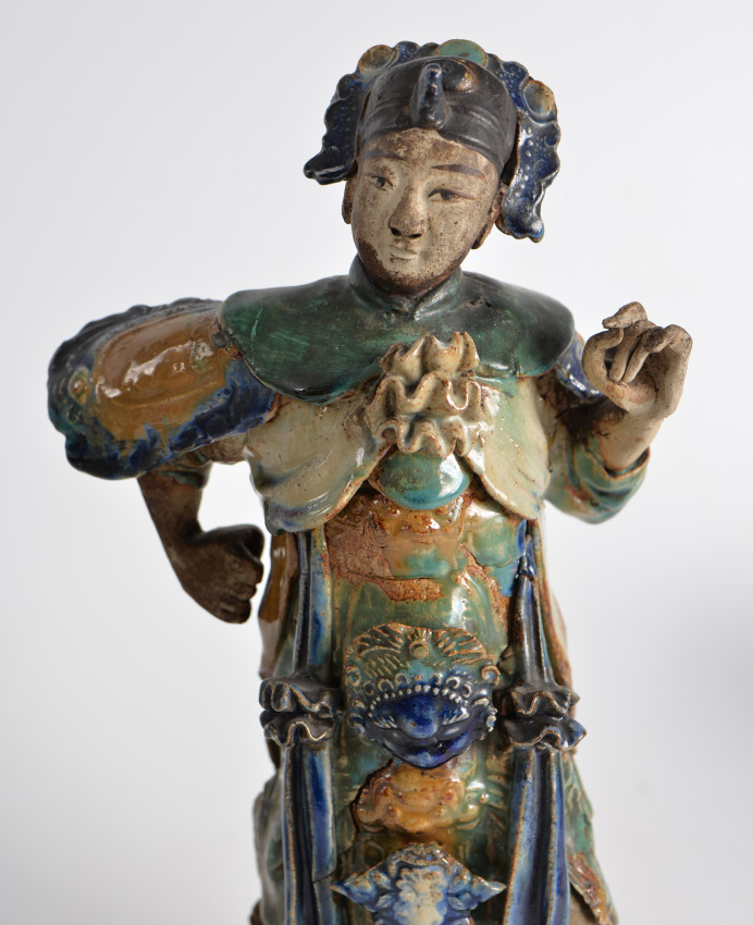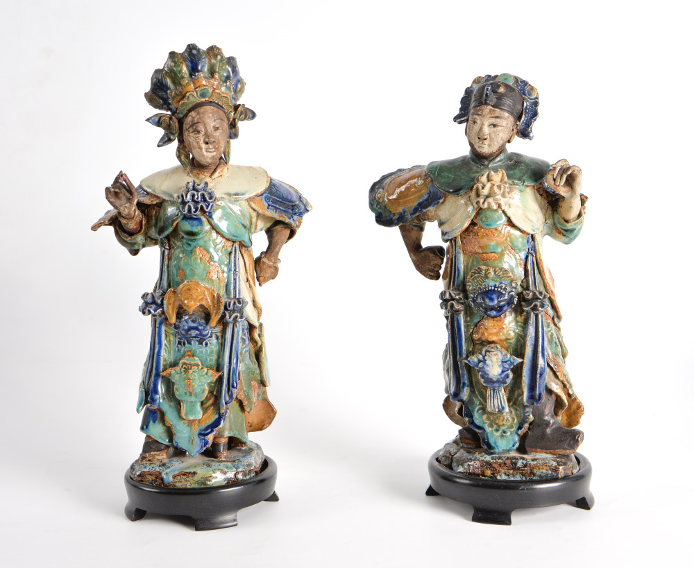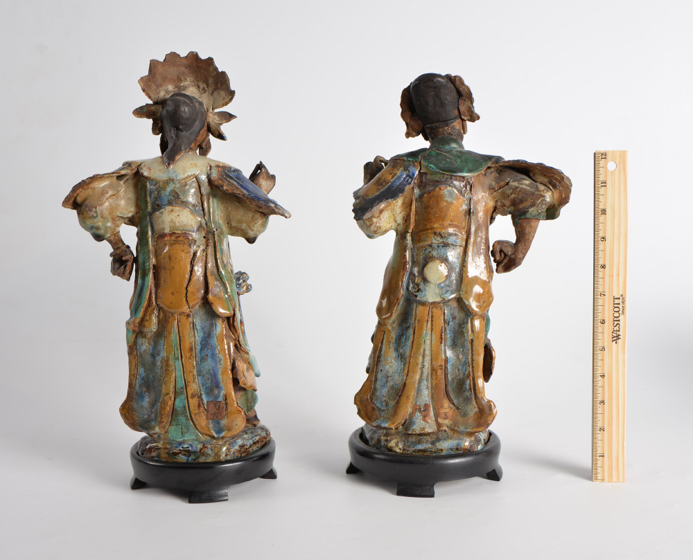 PAIR GLAZED CHINESE SANCAI STYLE POTTERY FIGURES: Polychrome earthenware glazed man and woman in ceremonial dress, each signed, taller of the 2 measures 15'' h. x 7 1/2'' x 4 1/2''. Each sold with a fitted wood base, 1 1/2'' x 5 1/2''.