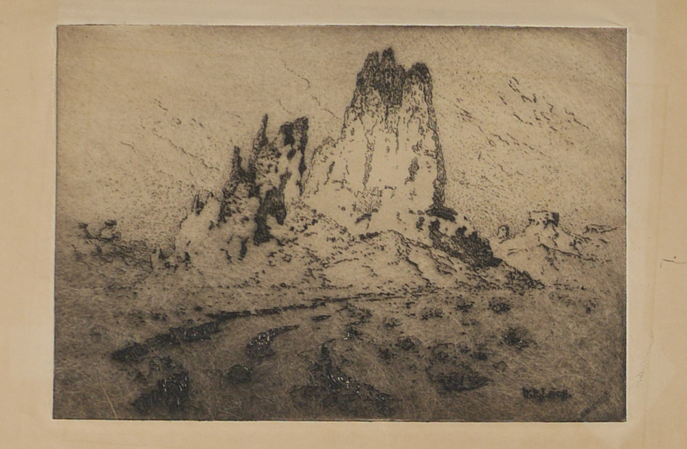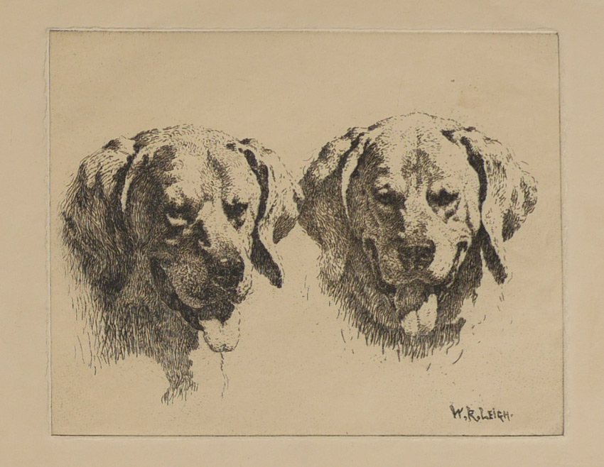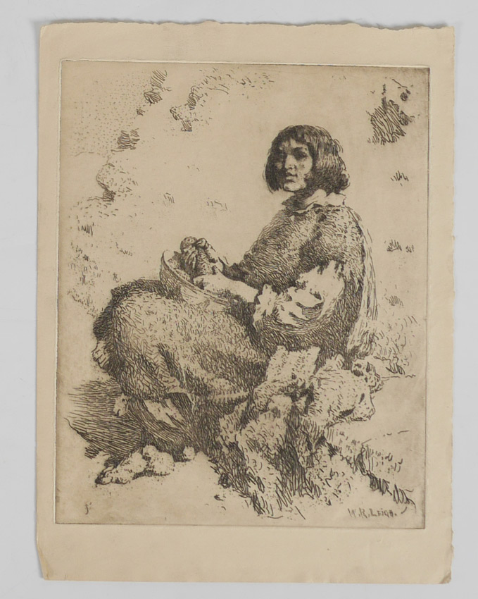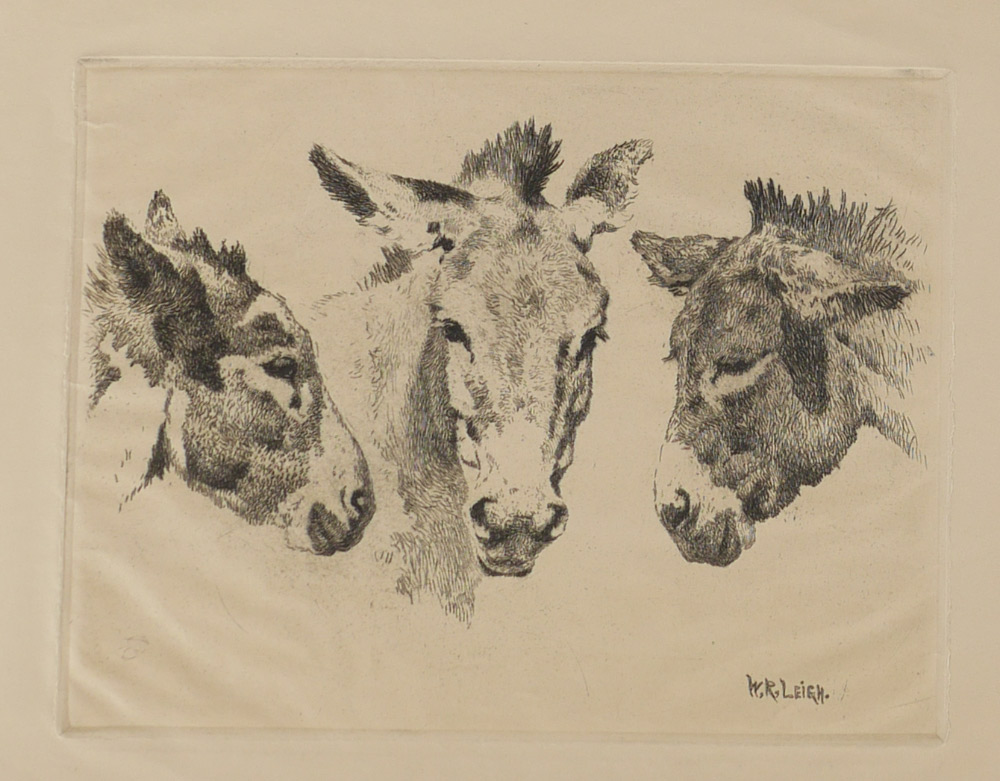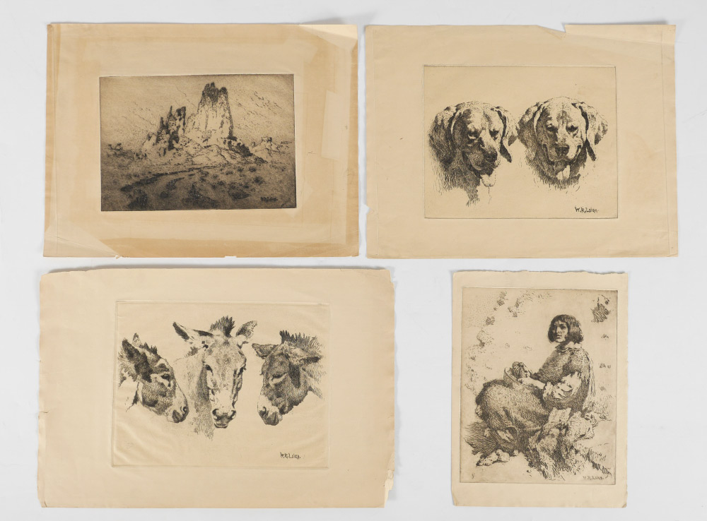 LEIGH, William Robinson, (American, 1866-1955): 4 Etchings, 1) Young Indian Girl Grinding Corn, 12'' x 9'' with margins, signed in the plate lower right, unframed; 2) Study of Two Dogs, 12'' x 16'' with margins, signed in the plate lower right, unframed; 3) Western Rocky Outcrop Landscape, 12'' x 16'' with margins, signed in the plate lower right, unframed; 4) Study of Three Donkey Heads, 12'' x 17.5'', signed in the plate lower right, unframed. Leigh studied at the Maryland Institute in Baltimore and the Royal Academy in Munich. He returned to the States and became sought after for his illustrations. In 1906 he found his calling with a trip to the Southwest to paint the Grand Canyon. He also painted Yellowstone National Park, but he was most interested in the Hopi and Navajo Indians. Provenance: Estate Collection of Christian Buchheit.